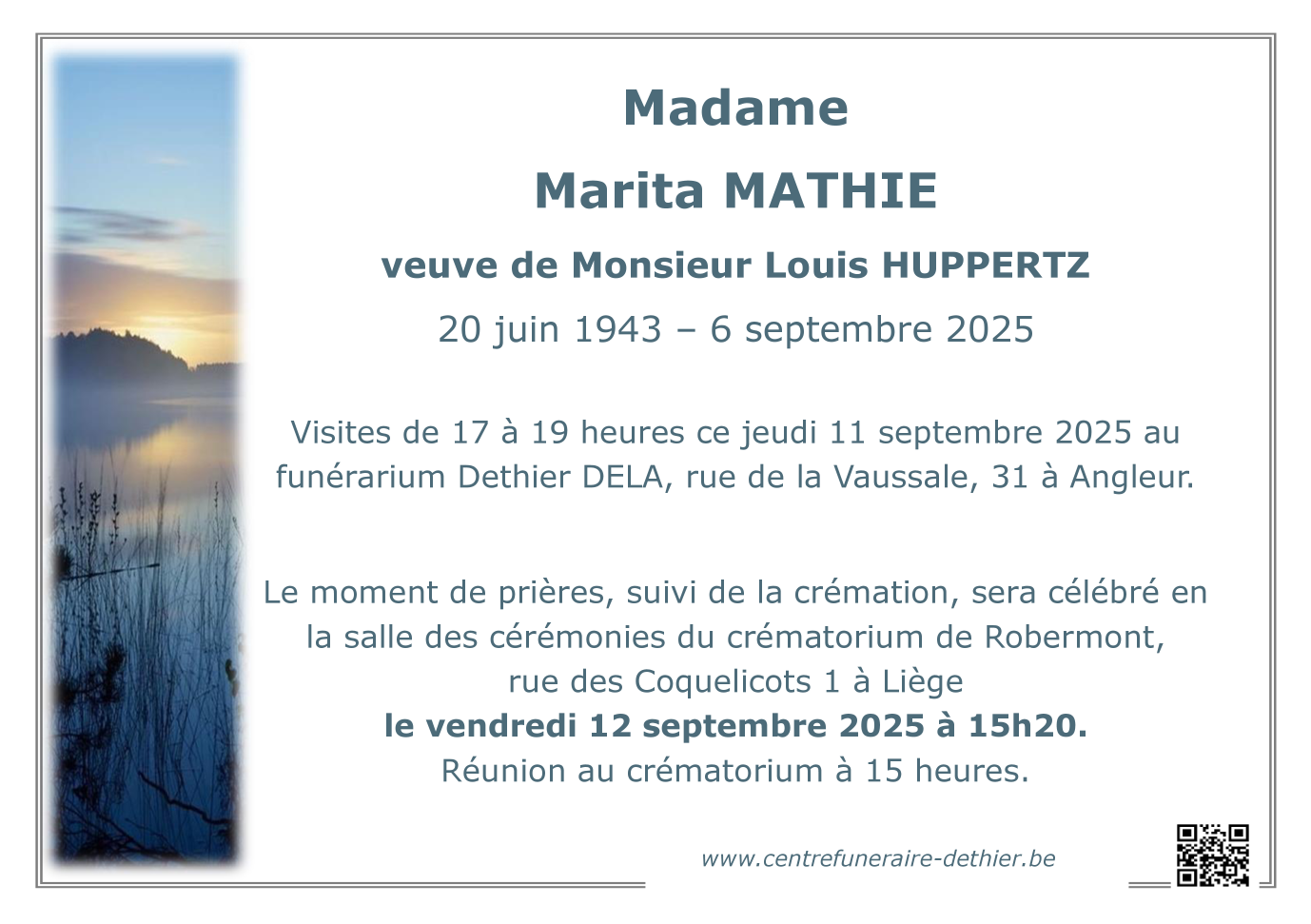 Décédée à Ougrée (4102, Belgique) le samedi 6 septembre 2025 à l'âge de 82 ans