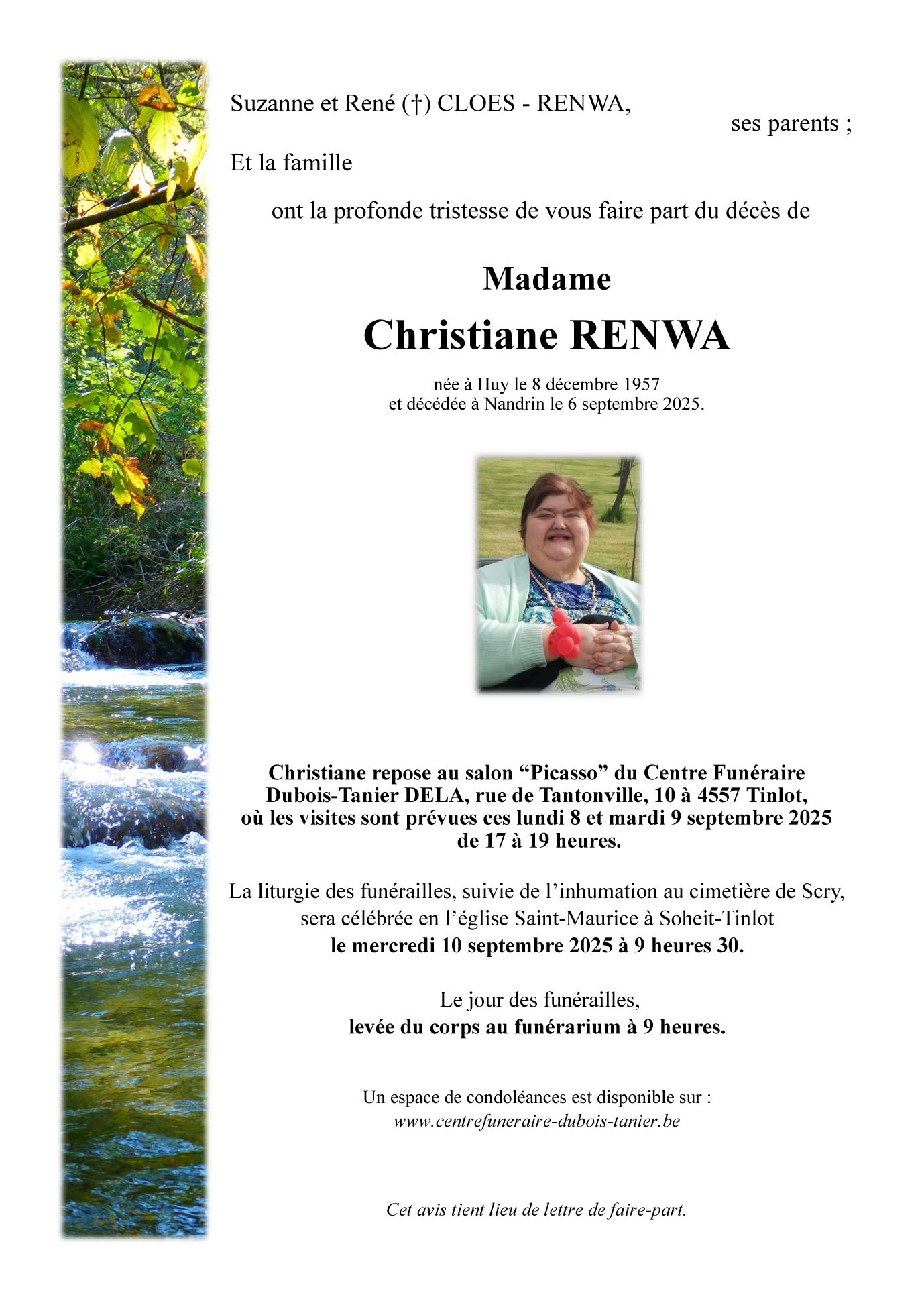 Décédée à Nandrin (4550, Belgique) le samedi 6 septembre 2025 à l'âge de 67 ans