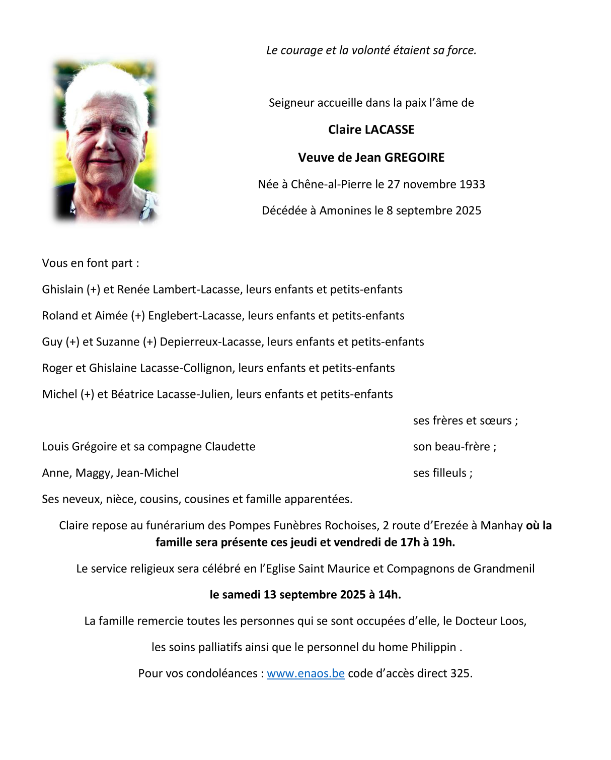 Décédée à Erezée (6997, Belgique) le lundi 8 septembre 2025 à l'âge de 91 ans