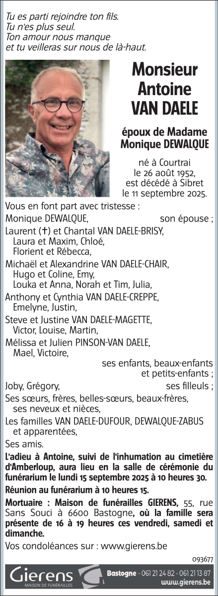 Décédé à Vaux-sur-Sure (6640, Belgique) le jeudi 11 septembre 2025 à l'âge de 73 ans