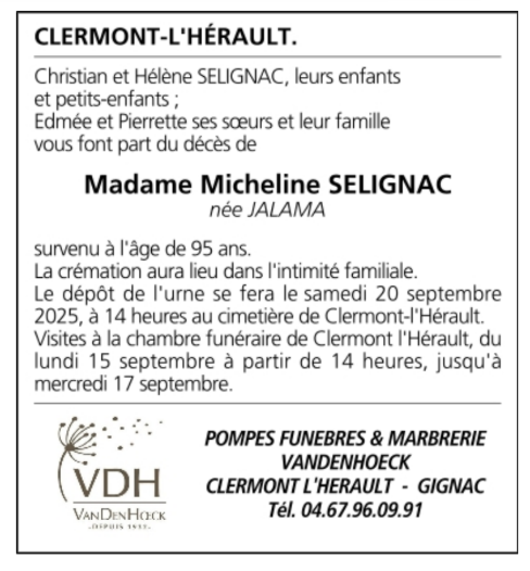 Décédée à Saint-André-de-Sangonis (34725, France) le samedi 13 septembre 2025 à l'âge de 94 ans
