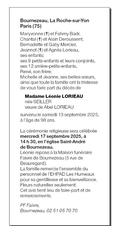 Overleden te Bournezeau (85480, Frankrijk) op zaterdag 13 september 2025 op 98-jarige leeftijd