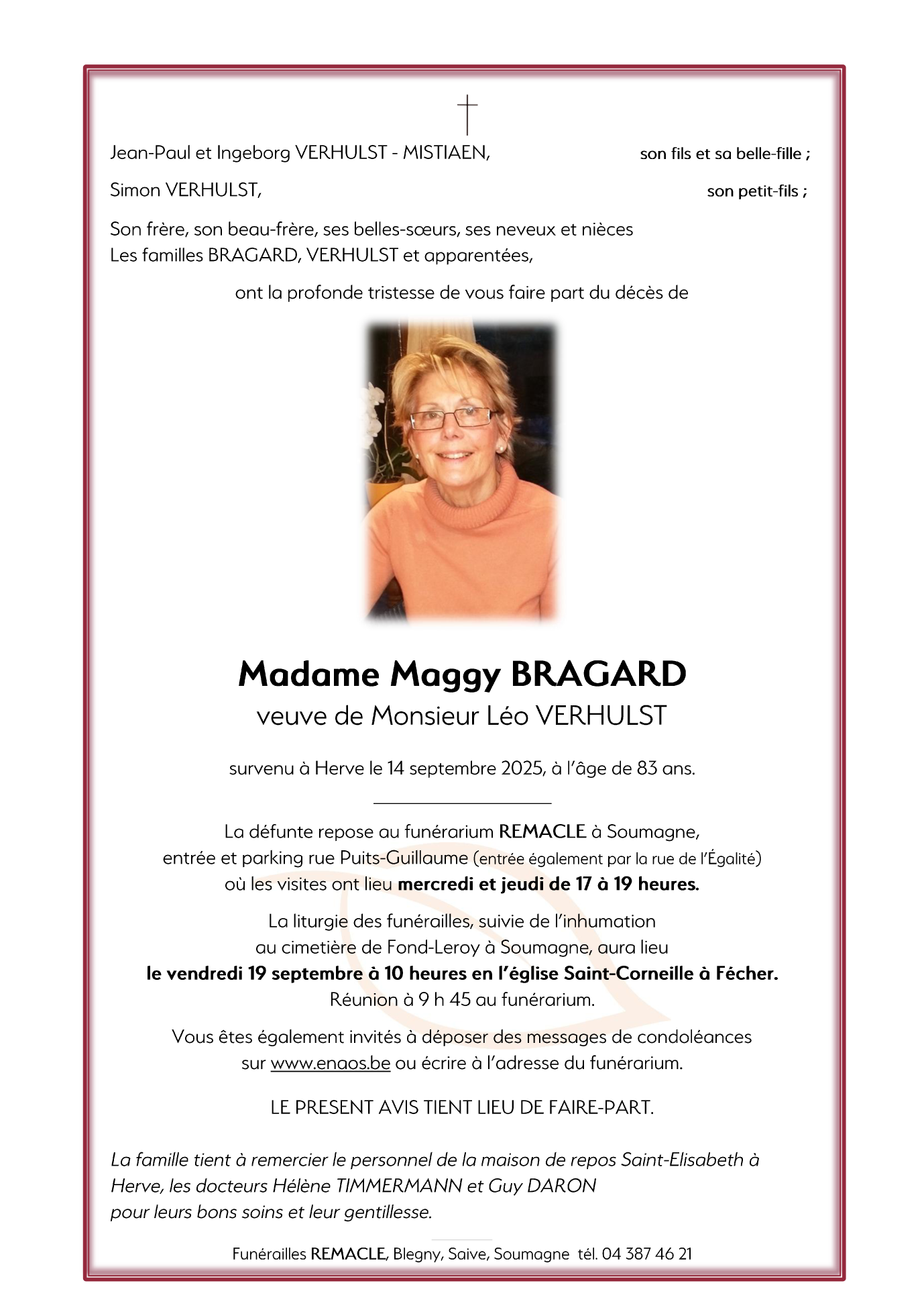 Décédée à Herve (4650, Belgique) le dimanche 14 septembre 2025 à l'âge de 83 ans