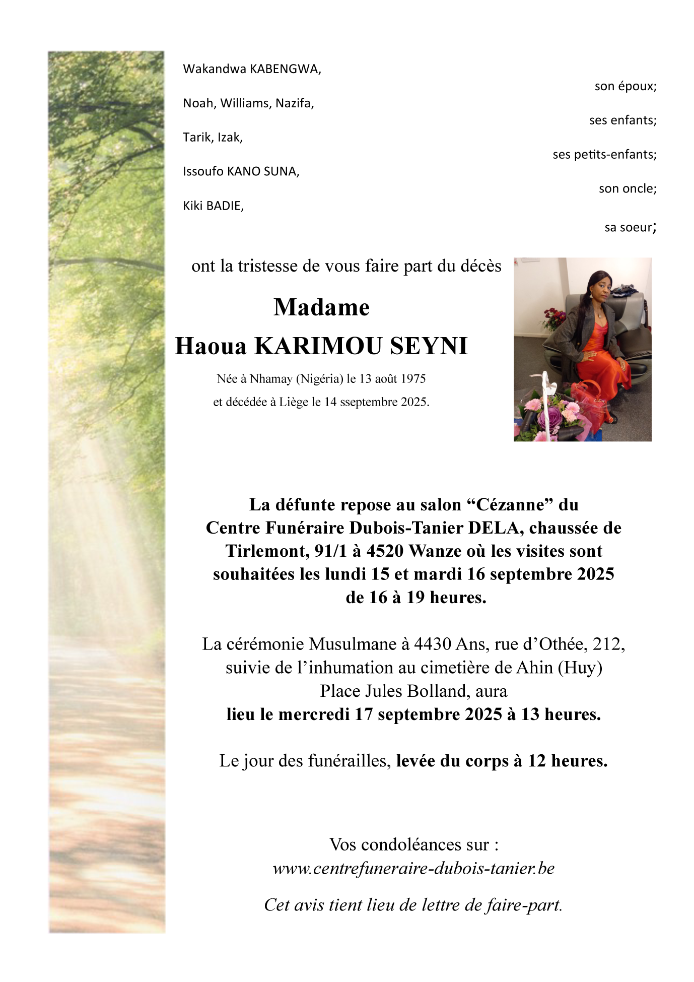 Décédée à Liège (4000, Belgique) le dimanche 14 septembre 2025 à l'âge de 50 ans