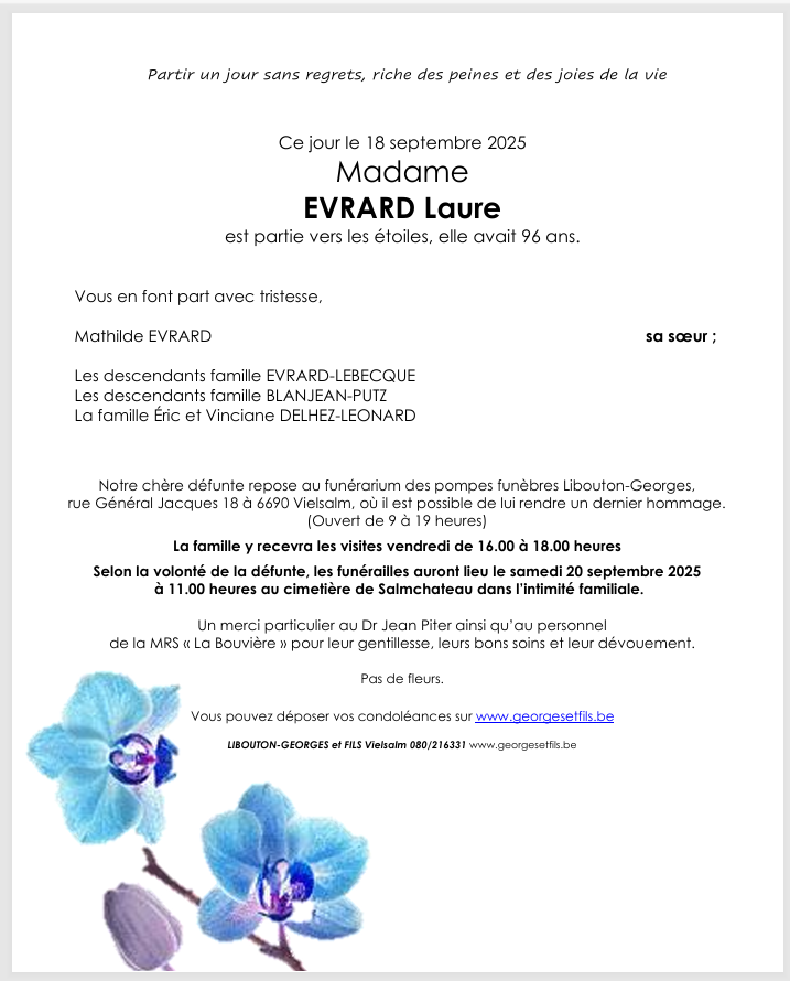 Décédée à Vielsalm (6690, Belgique) le jeudi 18 septembre 2025 à l'âge de 96 ans