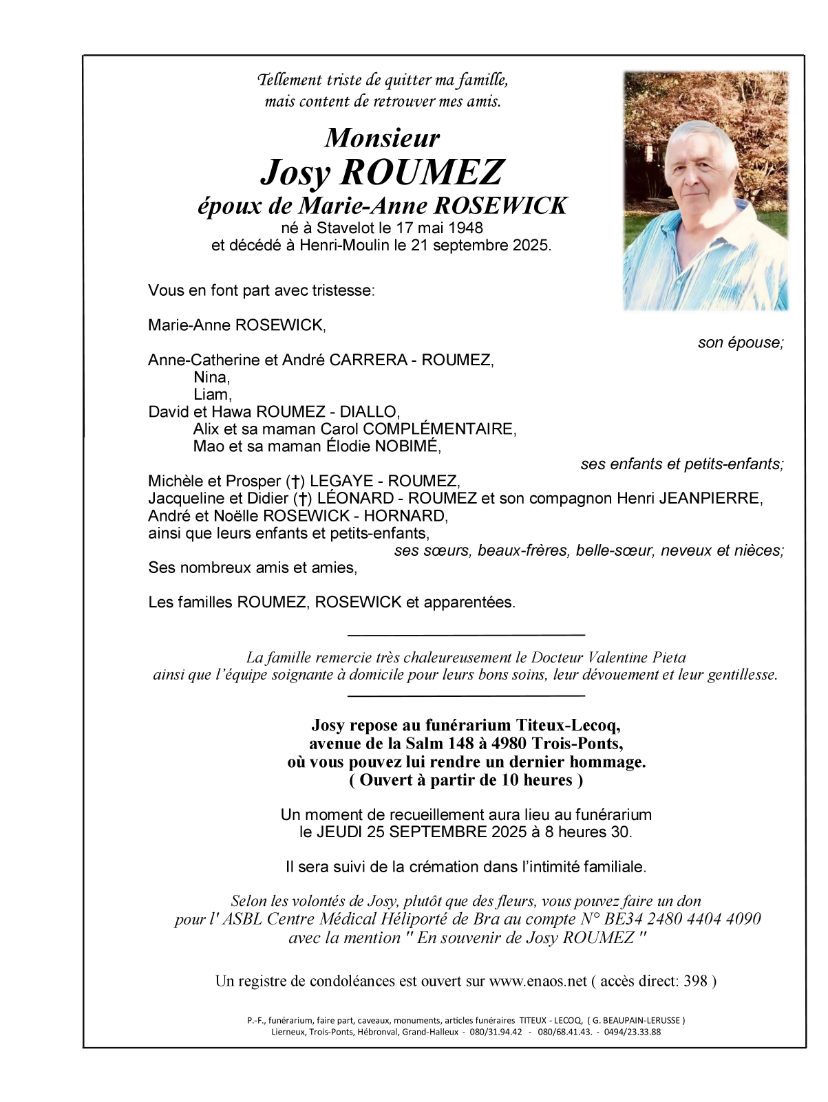 Décédé à Trois-Ponts (4980, Belgique) le dimanche 21 septembre 2025 à l'âge de 77 ans