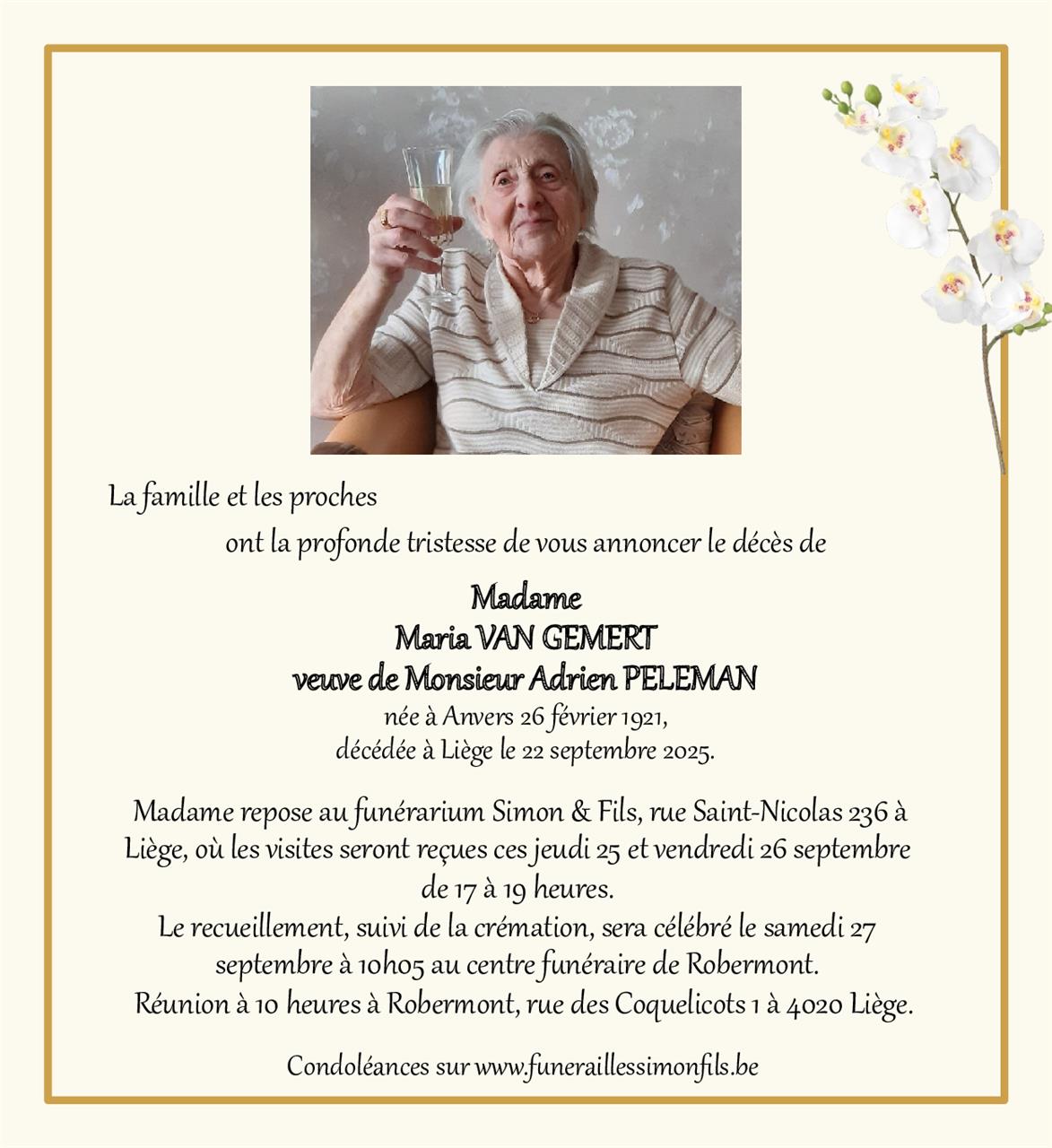 Décédée à Liège (4000, Belgique) le lundi 22 septembre 2025 à l'âge de 104 ans