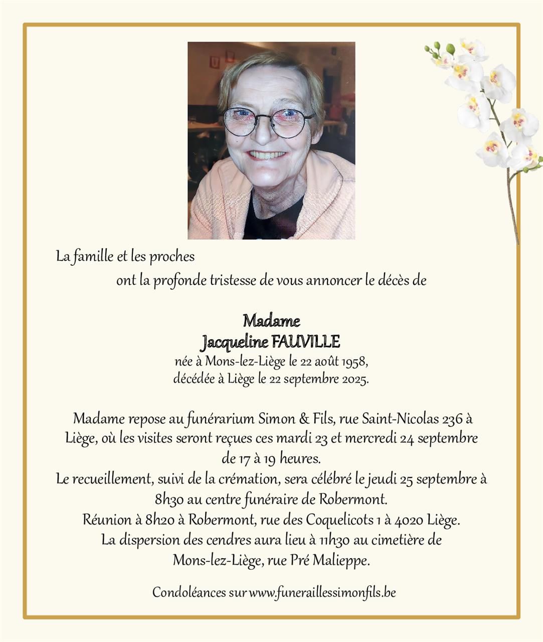 Décédée à Liège (4020, Belgique) le lundi 22 septembre 2025 à l'âge de 67 ans