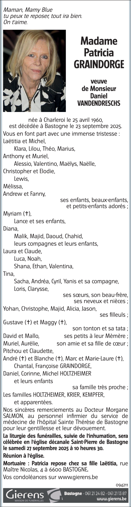 Décédée à Bastogne (6600, Belgique) le mardi 23 septembre 2025 à l'âge de 65 ans