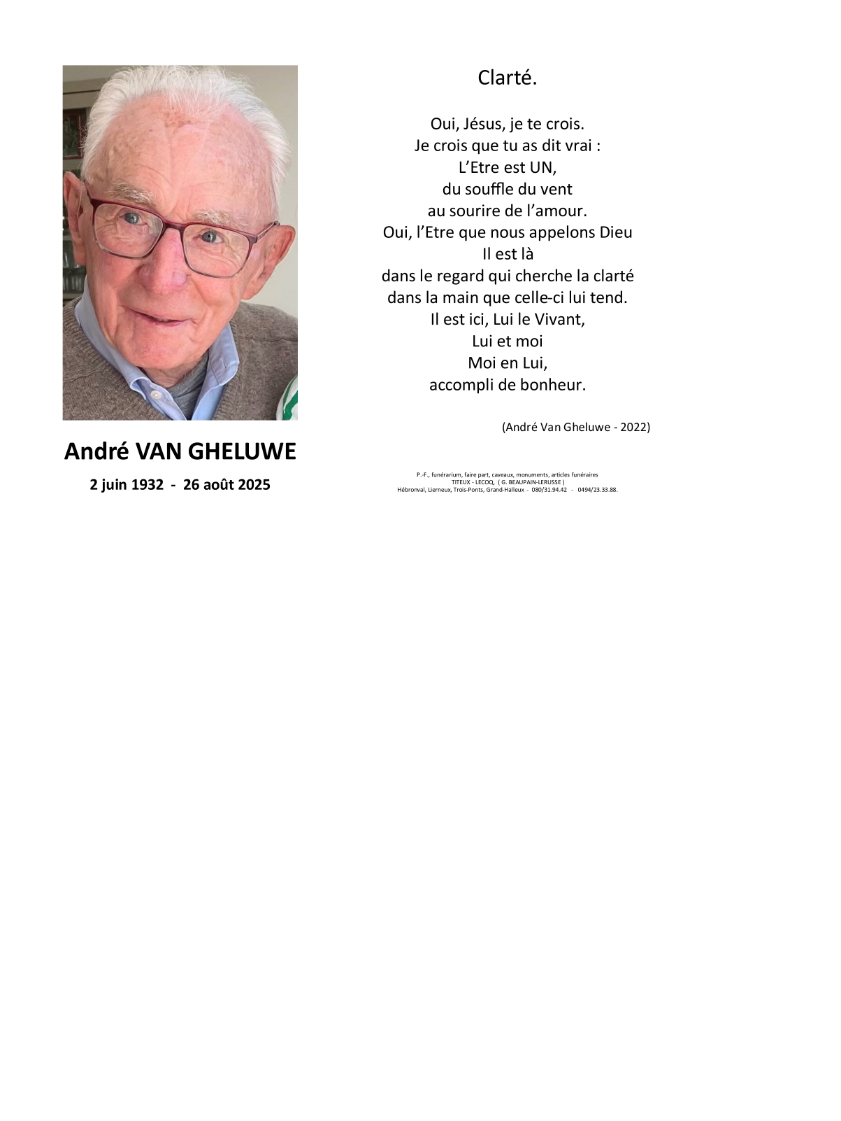 Décédé à Rahier (4987, Belgique) le mardi 26 août 2025 à l'âge de 93 ans