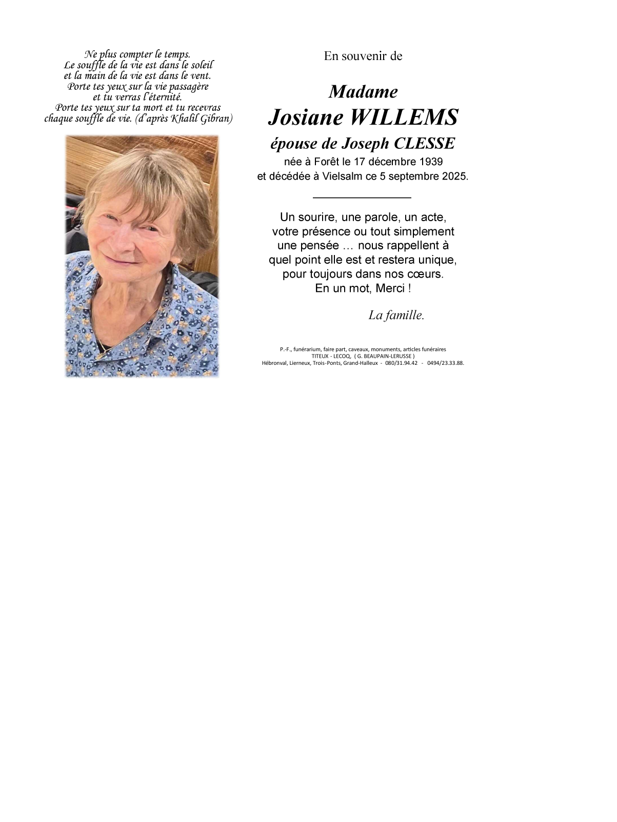 Décédée à Vielsalm (6690, Belgique) le vendredi 5 septembre 2025 à l'âge de 85 ans