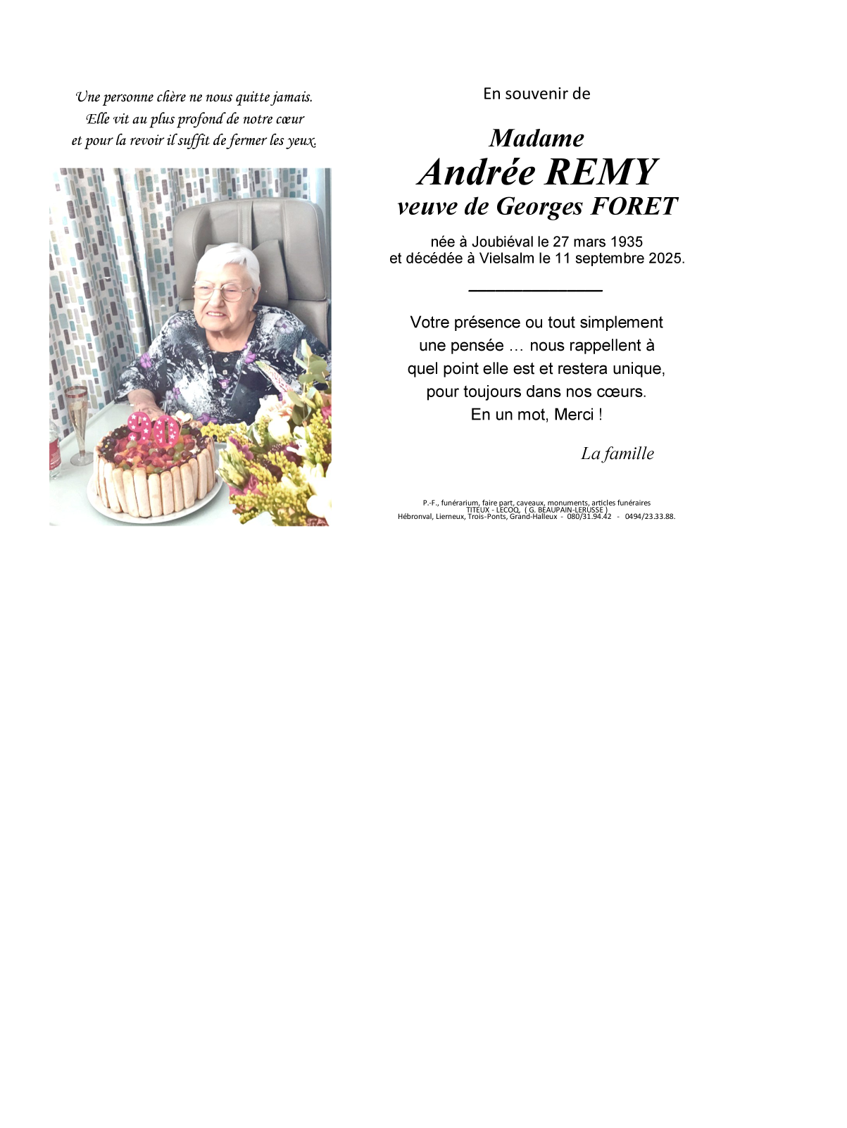 Décédée à Vielsalm (6690, Belgique) le jeudi 11 septembre 2025 à l'âge de 90 ans