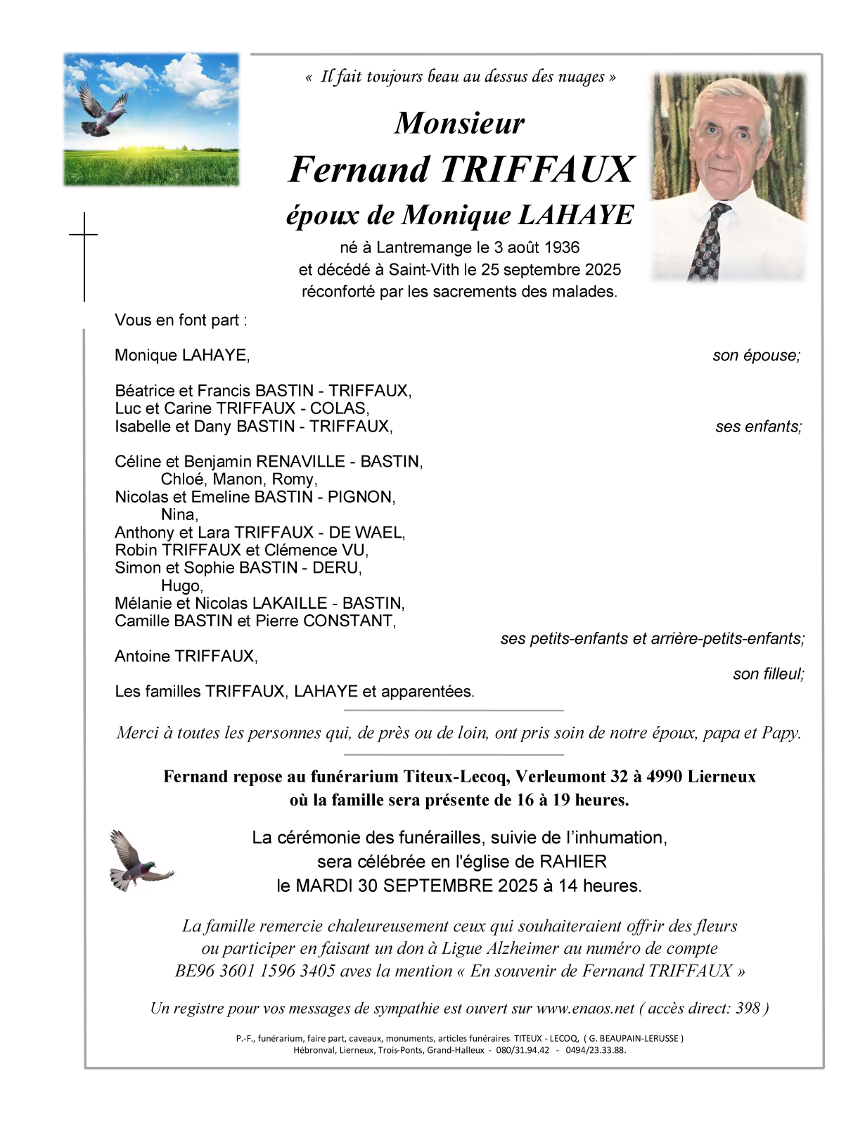 Né à Lantremange (4300, Belgique) le lundi 3 août 1936
