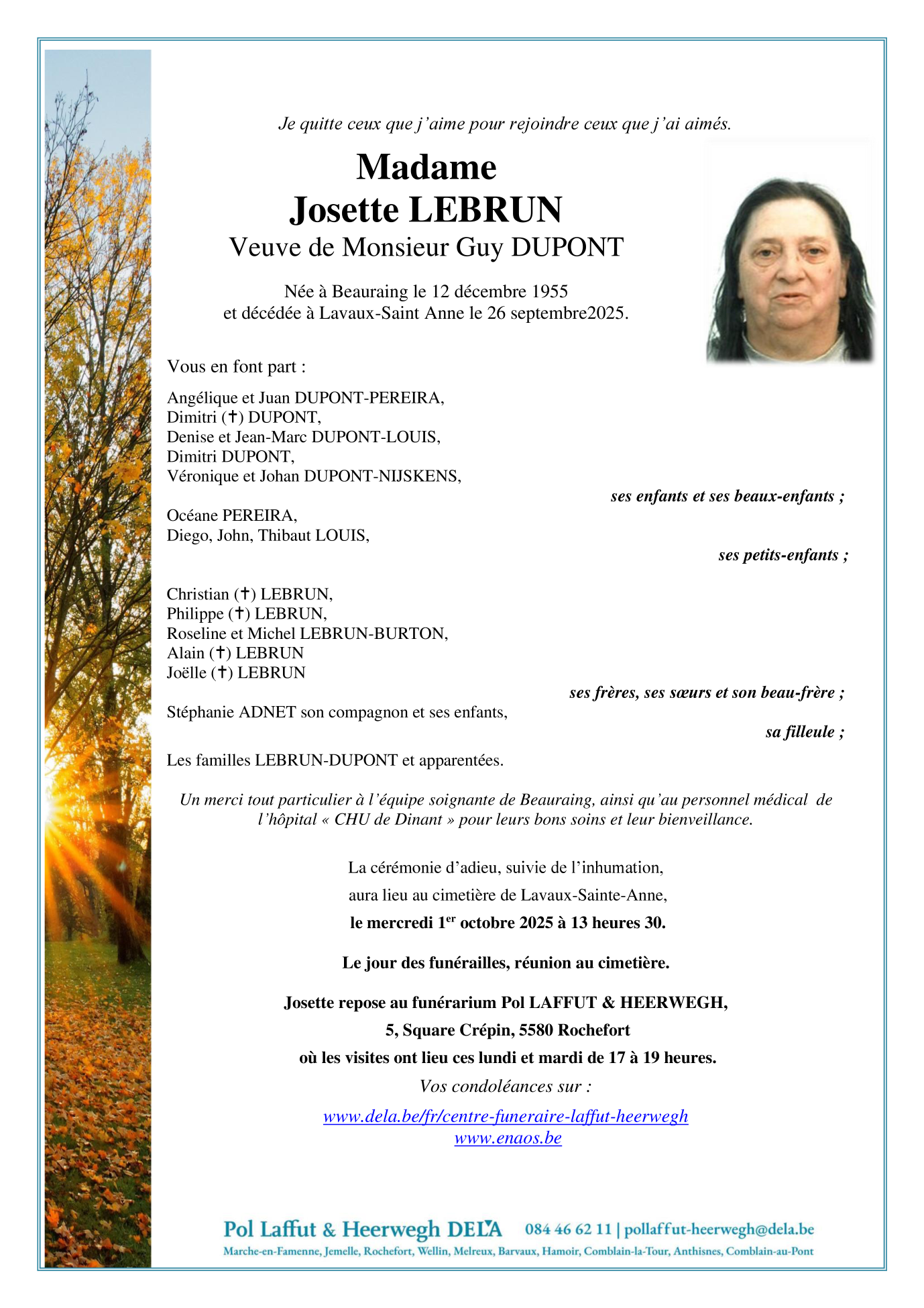 Décédée à Lavaux-Sainte-Anne (5580, Belgique) le vendredi 26 septembre 2025 à l'âge de 69 ans
