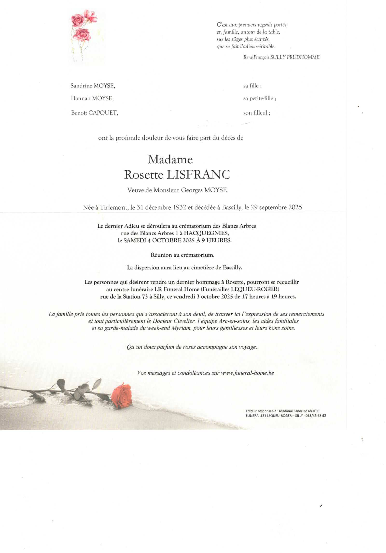 Décédée à Bassilly (7830, Belgique) le lundi 29 septembre 2025 à l'âge de 92 ans