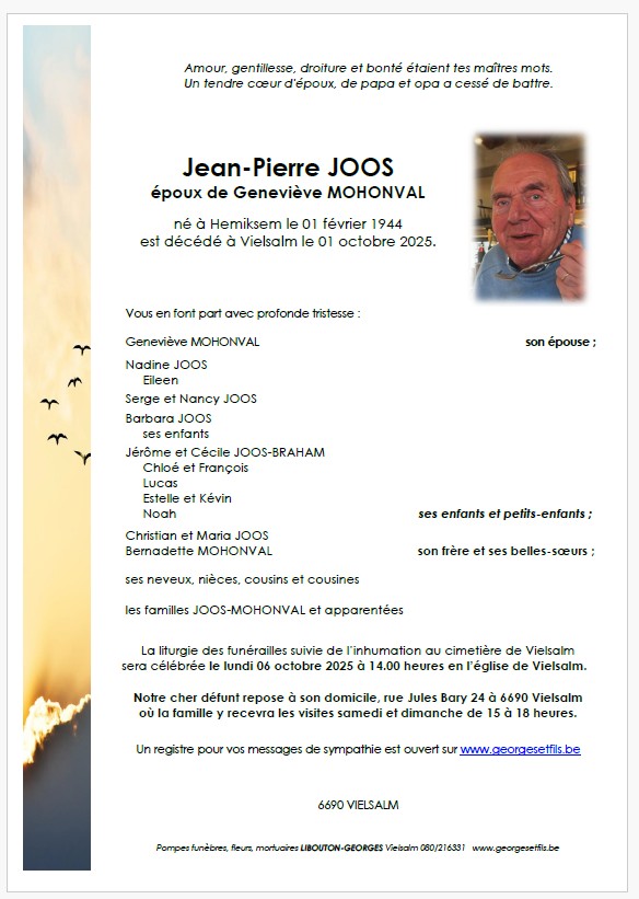 Décédé à Vielsalm (6690, Belgique) le mercredi 1 octobre 2025 à l'âge de 81 ans