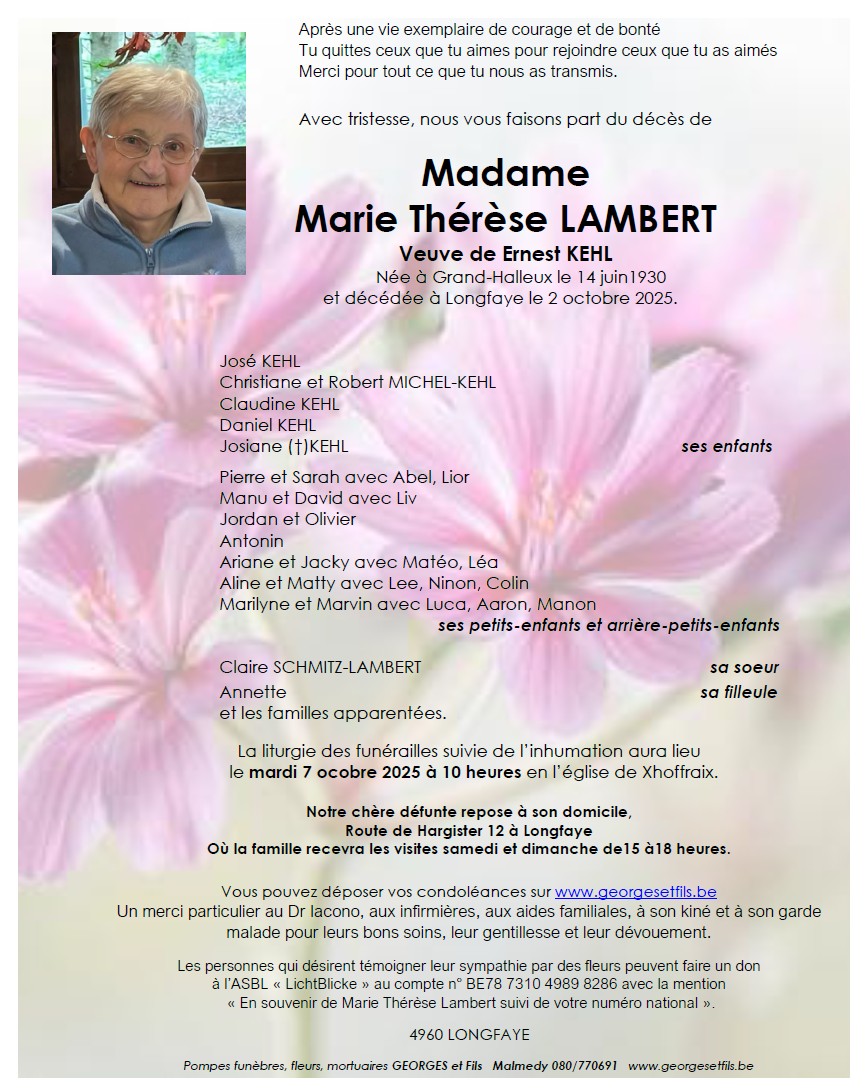 Décédée à Longfaye (4960, Belgique) le jeudi 2 octobre 2025 à l'âge de 95 ans