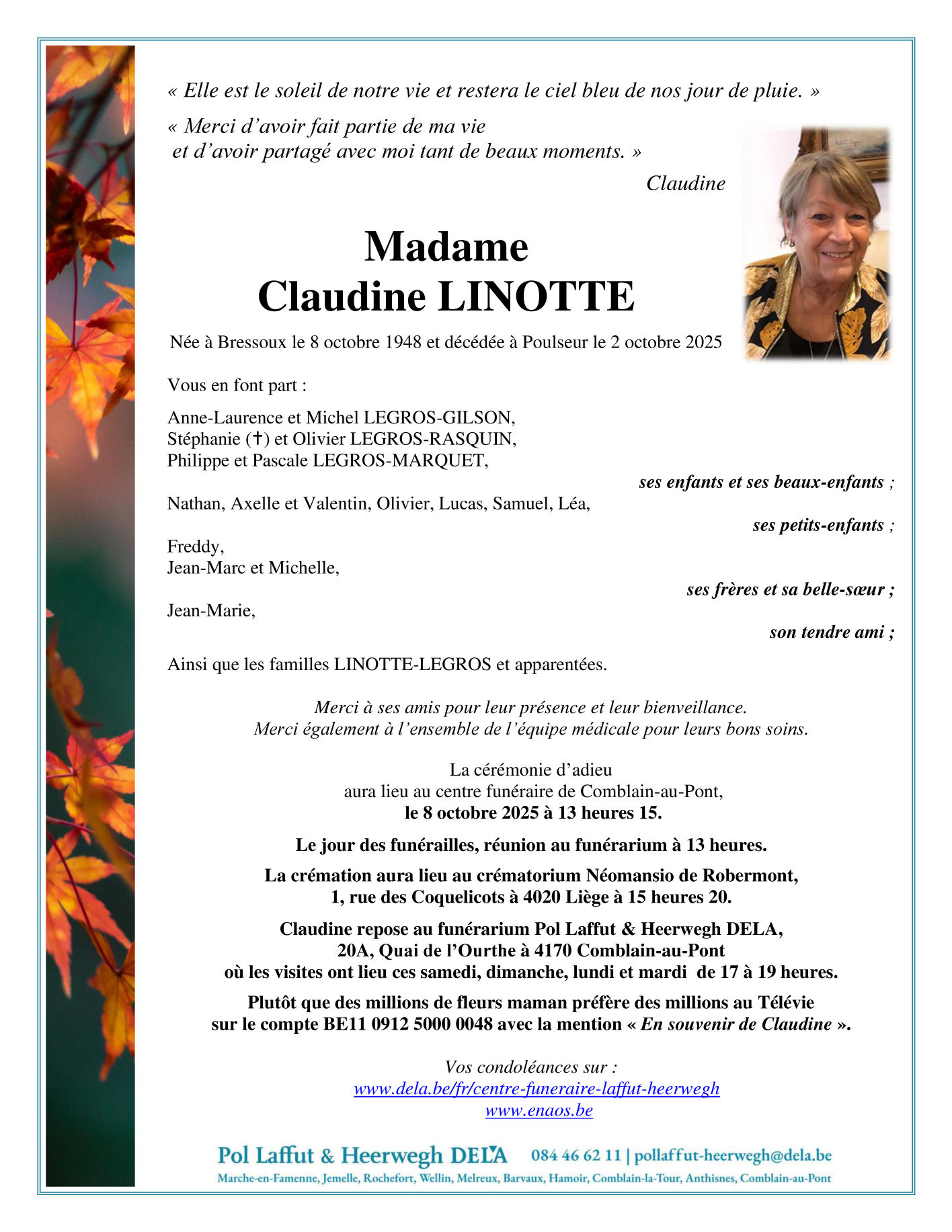 Décédée à Poulseur (4171, Belgique) le jeudi 2 octobre 2025 à l'âge de 76 ans