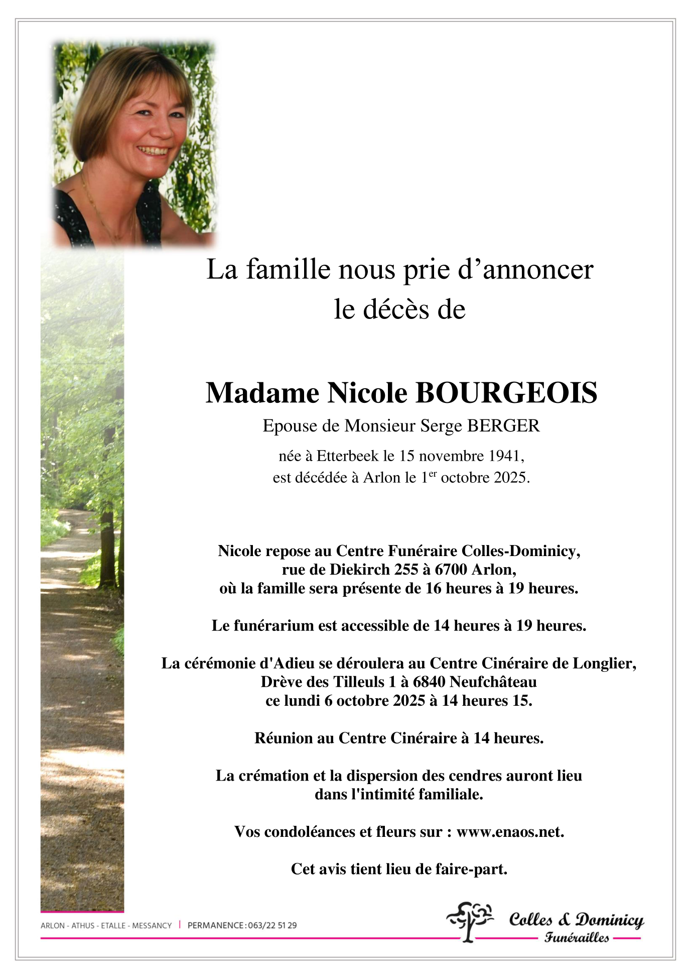 Décédée à Arlon (6700, Belgique) le mercredi 1 octobre 2025 à l'âge de 83 ans