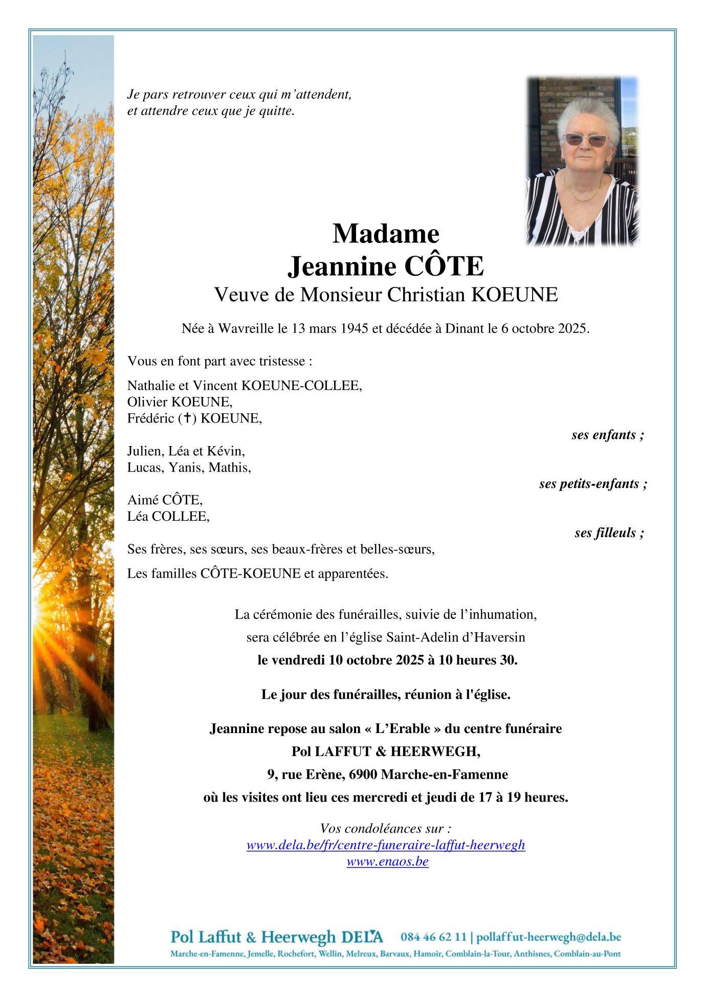 Décédée à Dinant (5500, Belgique) le lundi 6 octobre 2025 à l'âge de 80 ans