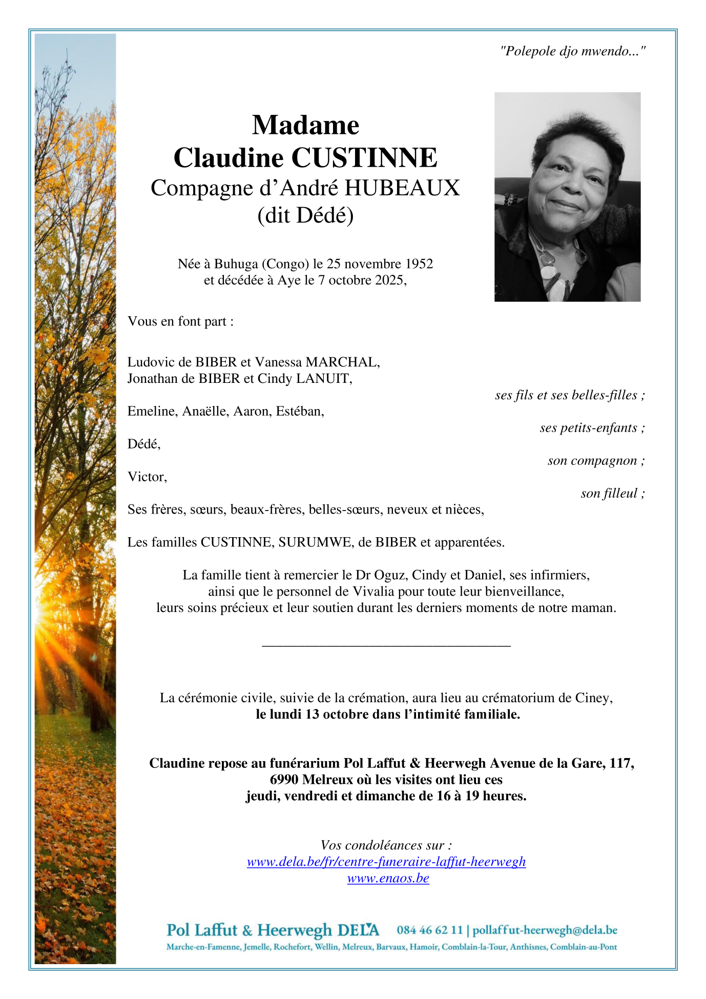 Décédée à Aye (6900, Belgique) le mardi 7 octobre 2025 à l'âge de 72 ans