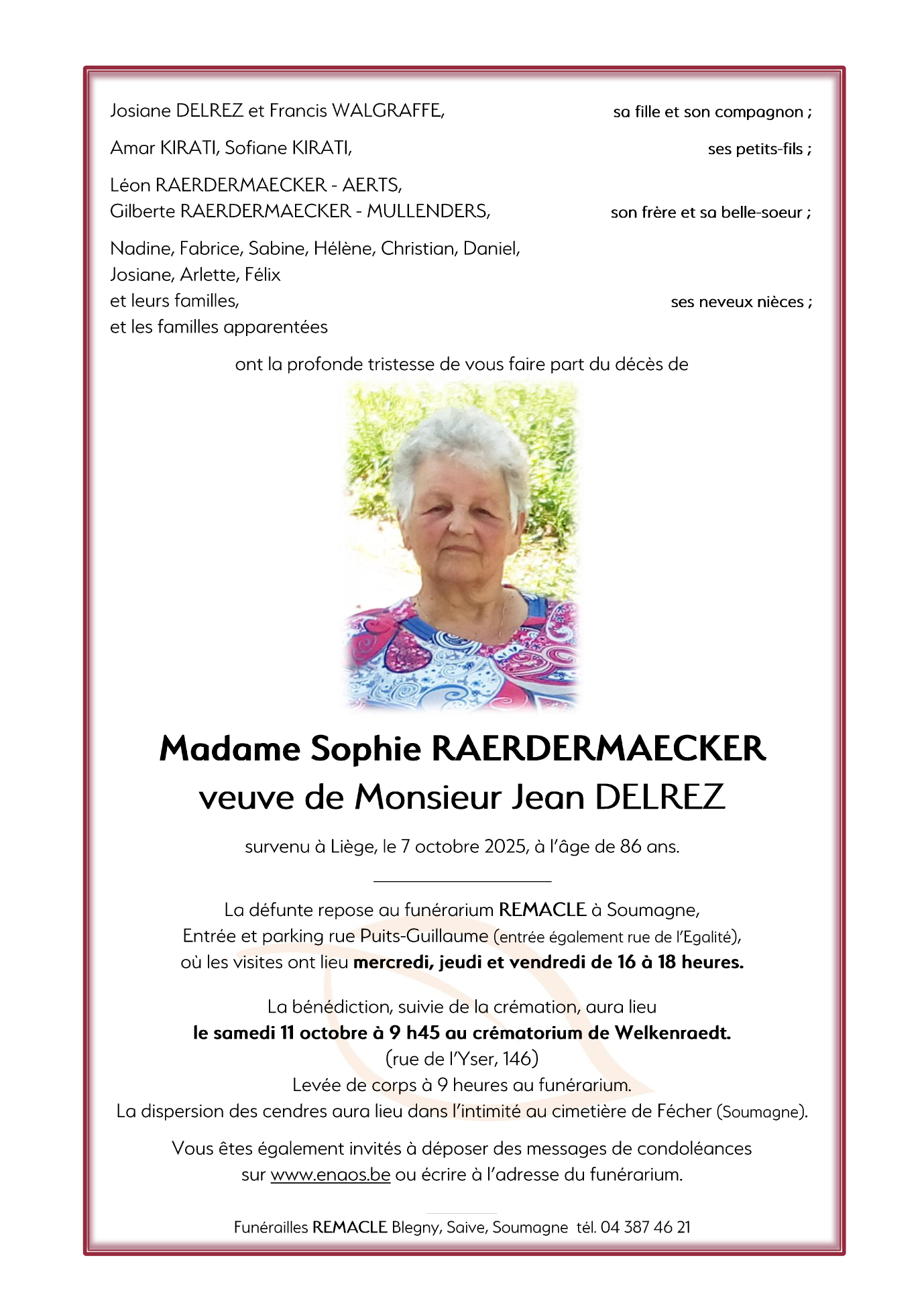 Décédée à Liège (4000, Belgique) le mardi 7 octobre 2025 à l'âge de 86 ans