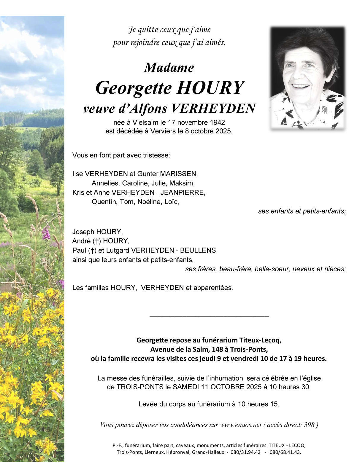 Décédée à Verviers (4800, Belgique) le mercredi 8 octobre 2025 à l'âge de 82 ans