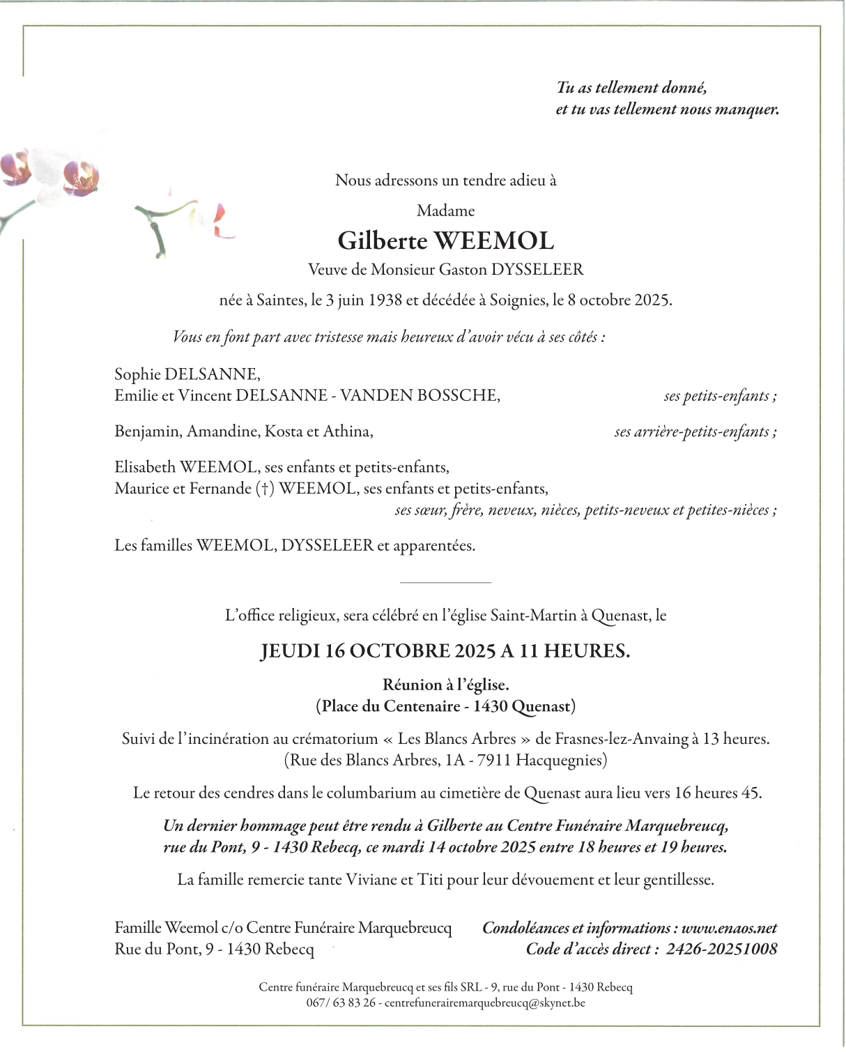 Décédée à Soignies (7060, Belgique) le mercredi 8 octobre 2025 à l'âge de 87 ans
