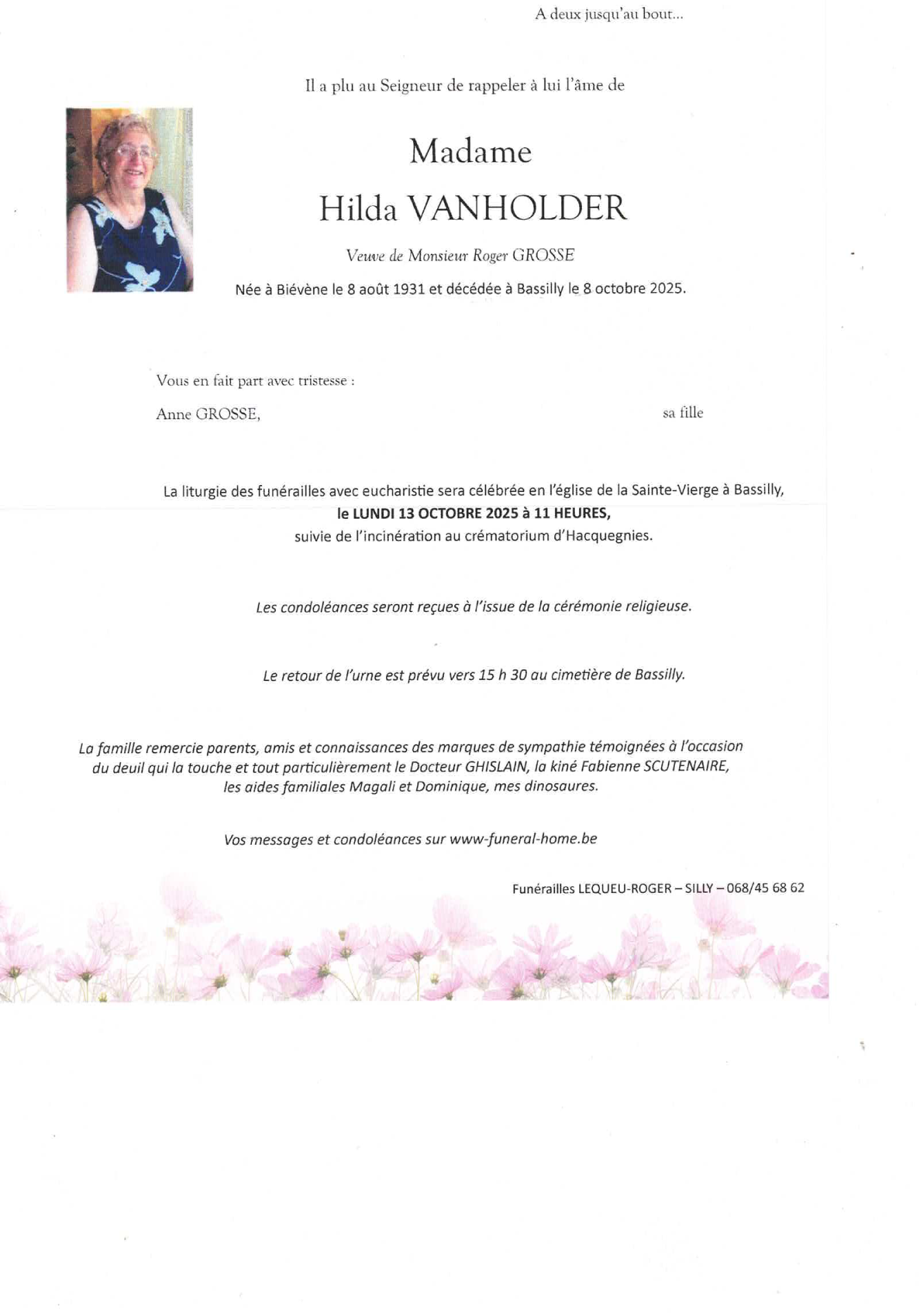 Décédée à Bassilly (7830, Belgique) le mercredi 8 octobre 2025 à l'âge de 94 ans