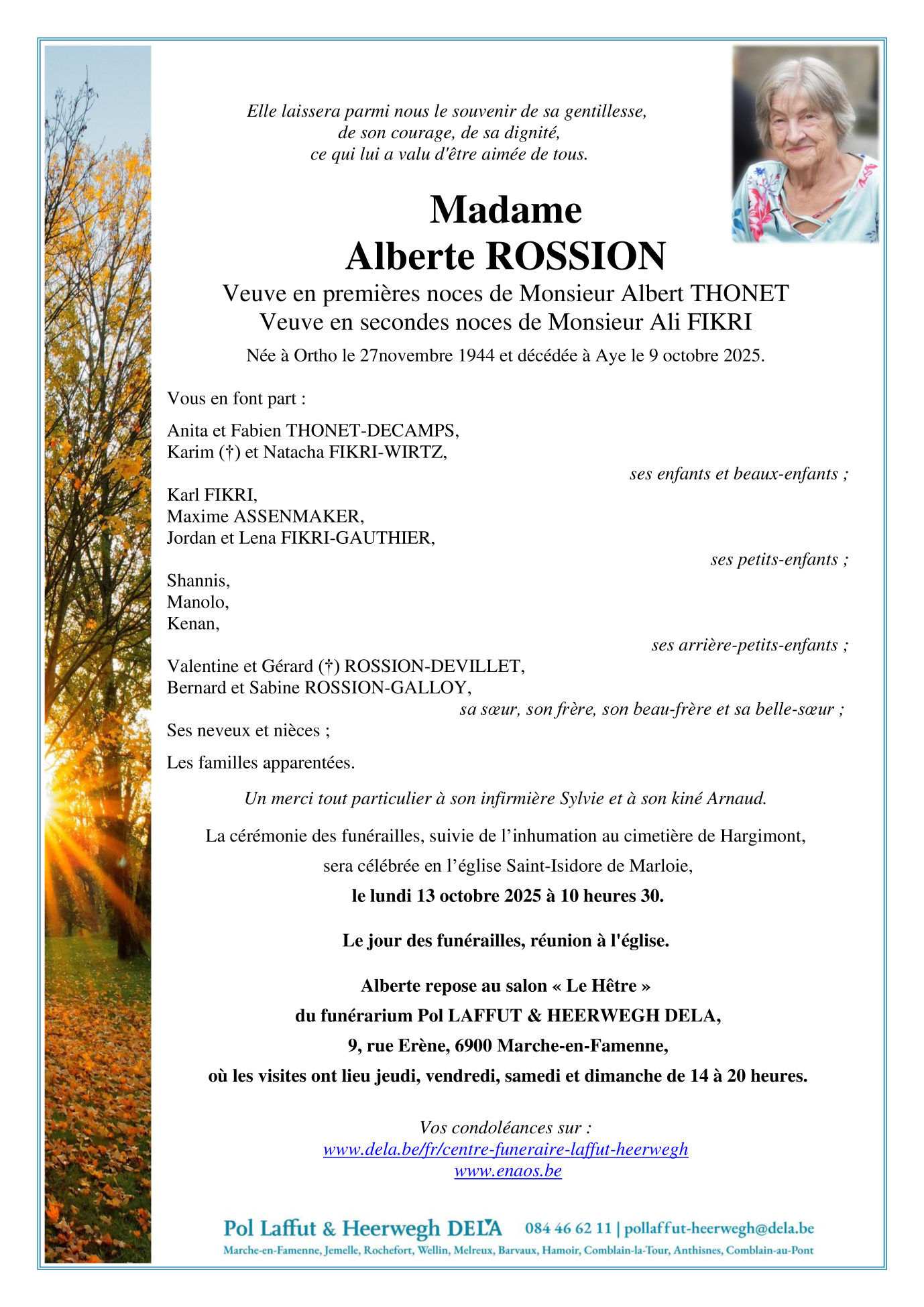 Décédée à Aye (6900, Belgique) le jeudi 9 octobre 2025 à l'âge de 80 ans