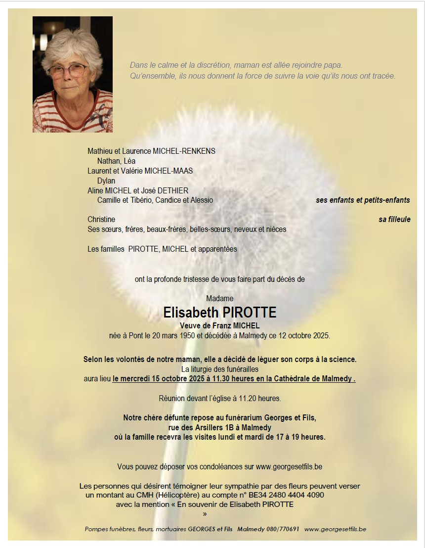 Décédée à Malmedy (4960, Belgique) le dimanche 12 octobre 2025 à l'âge de 75 ans