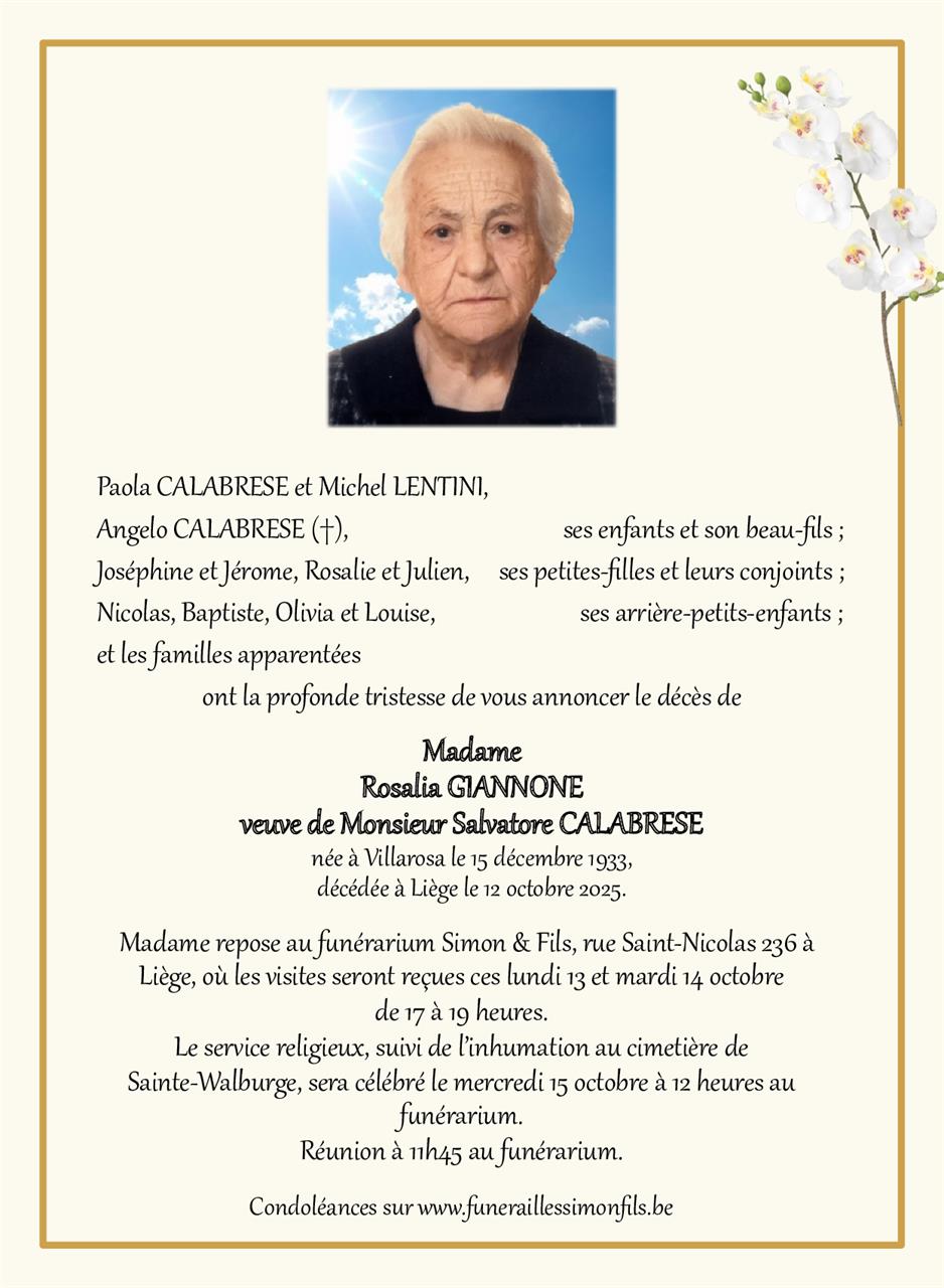 Décédée à Liège (4000, Belgique) le dimanche 12 octobre 2025 à l'âge de 91 ans
