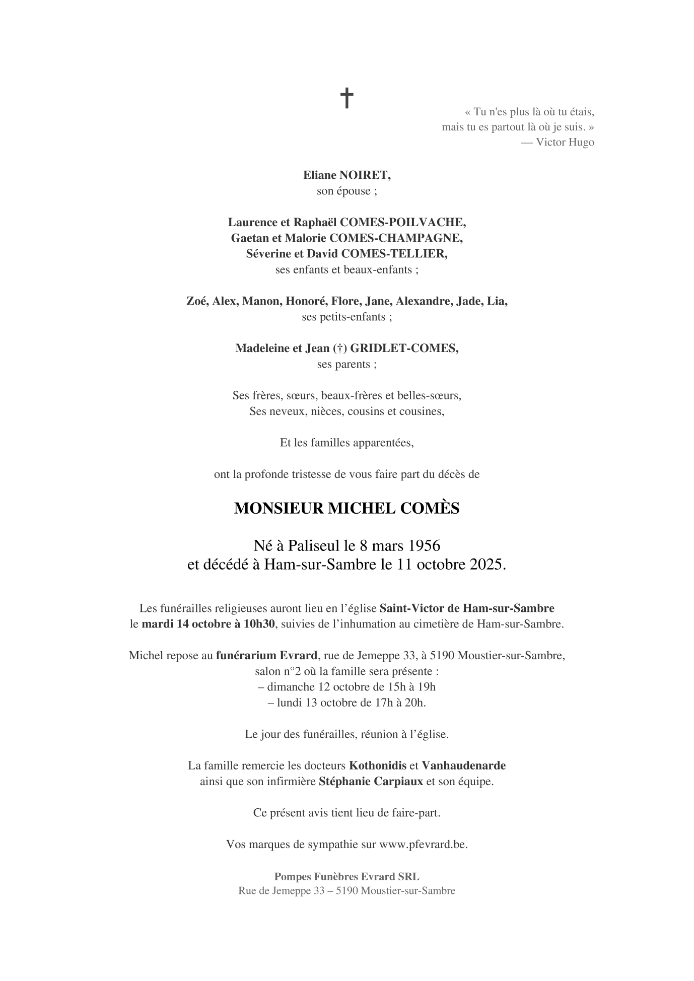 Décédé à Ham-sur-Sambre (5190, Belgique) le samedi 11 octobre 2025 à l'âge de 69 ans