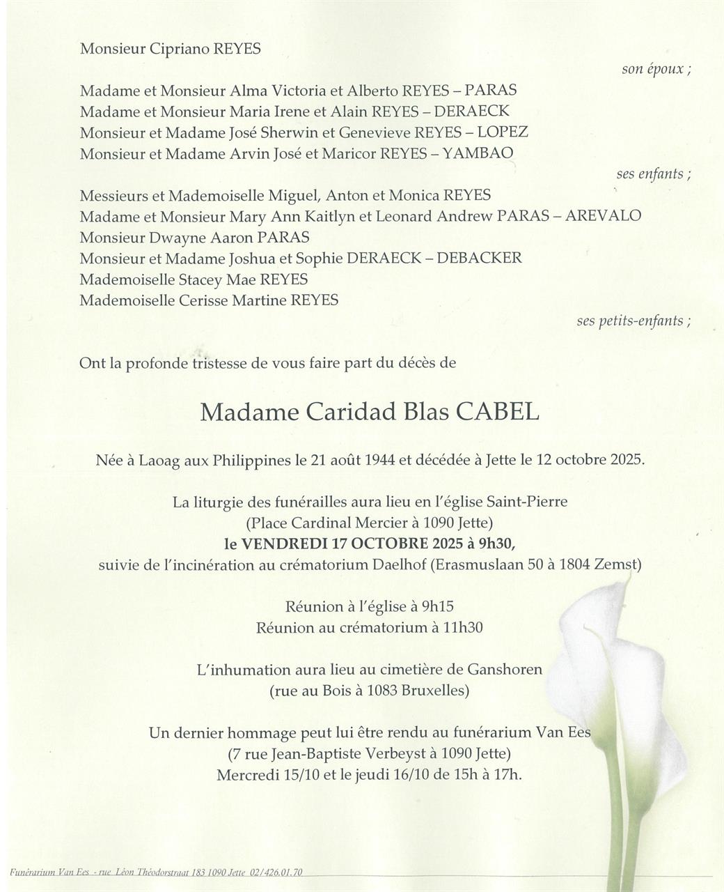 Died in Bruxelles (Jette) (1090, Belgium) on 13 October 2025 at the age of 81 years