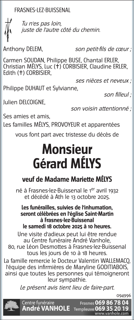 Décédé à Ath (7800, Belgique) le lundi 13 octobre 2025 à l'âge de 93 ans