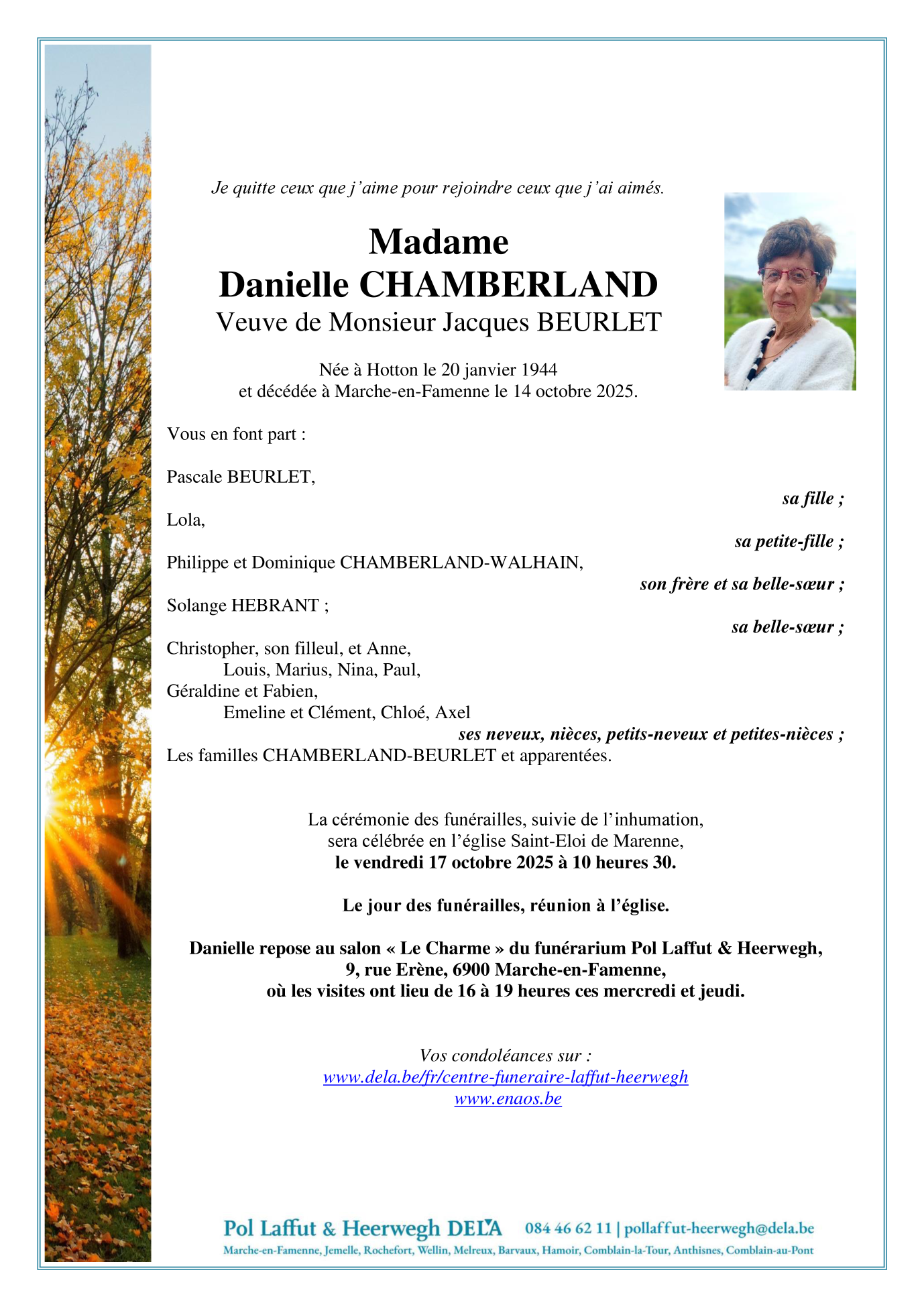 Décédée à Marche-en-Famenne (6900, Belgique) le mardi 14 octobre 2025 à l'âge de 81 ans