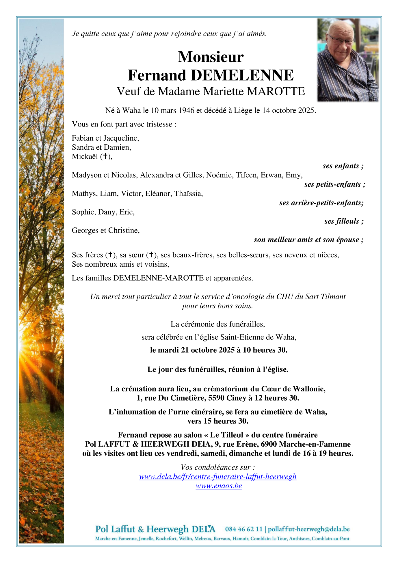 Décédé à Liège (4000, Belgique) le mardi 14 octobre 2025 à l'âge de 79 ans