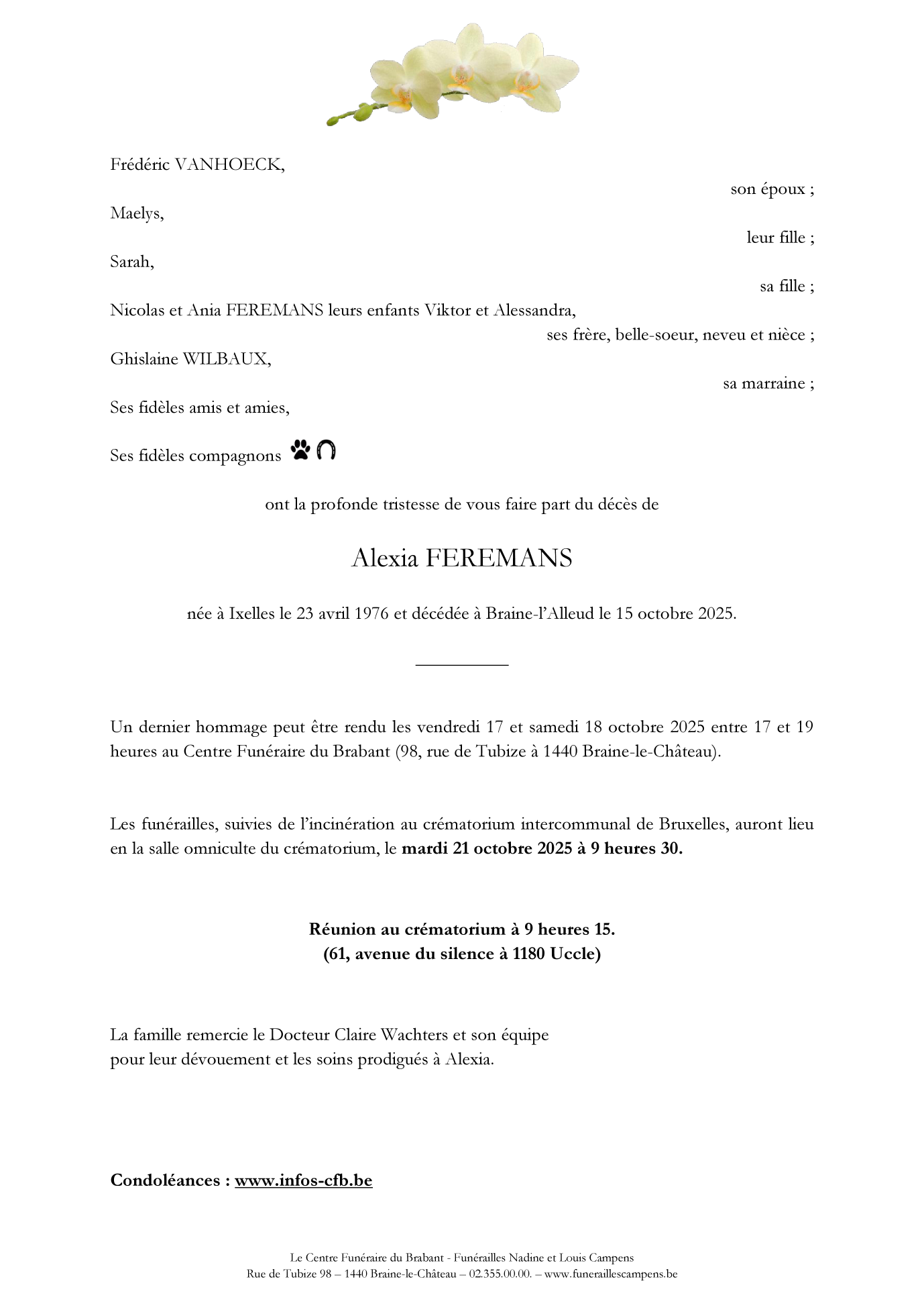 Décédée à Braine-l'Alleud (1420, Belgique) le mercredi 15 octobre 2025 à l'âge de 49 ans