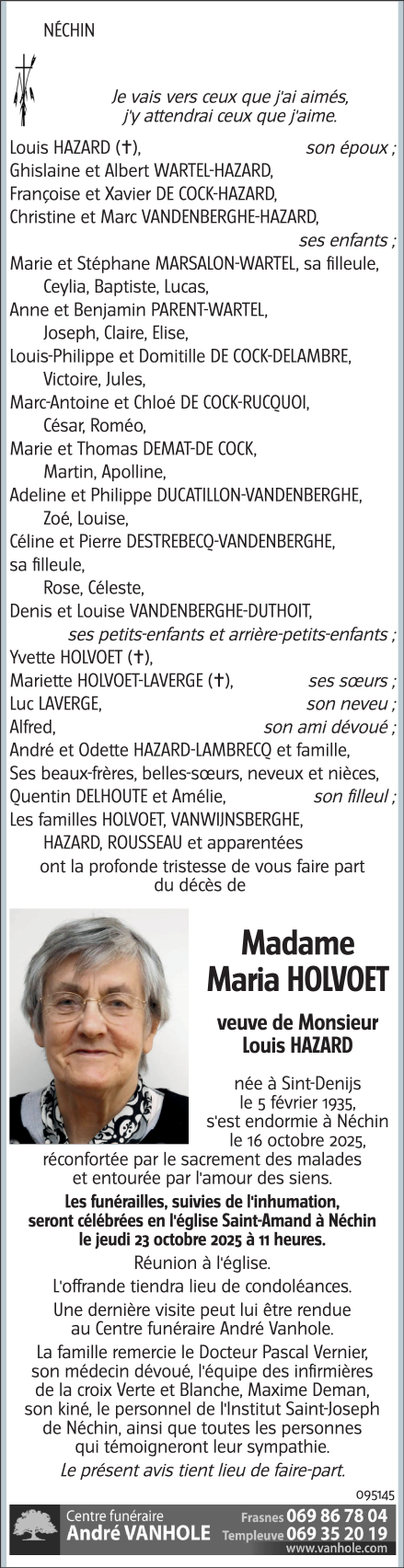 Décédée à Néchin (7730, Belgique) le jeudi 16 octobre 2025 à l'âge de 90 ans