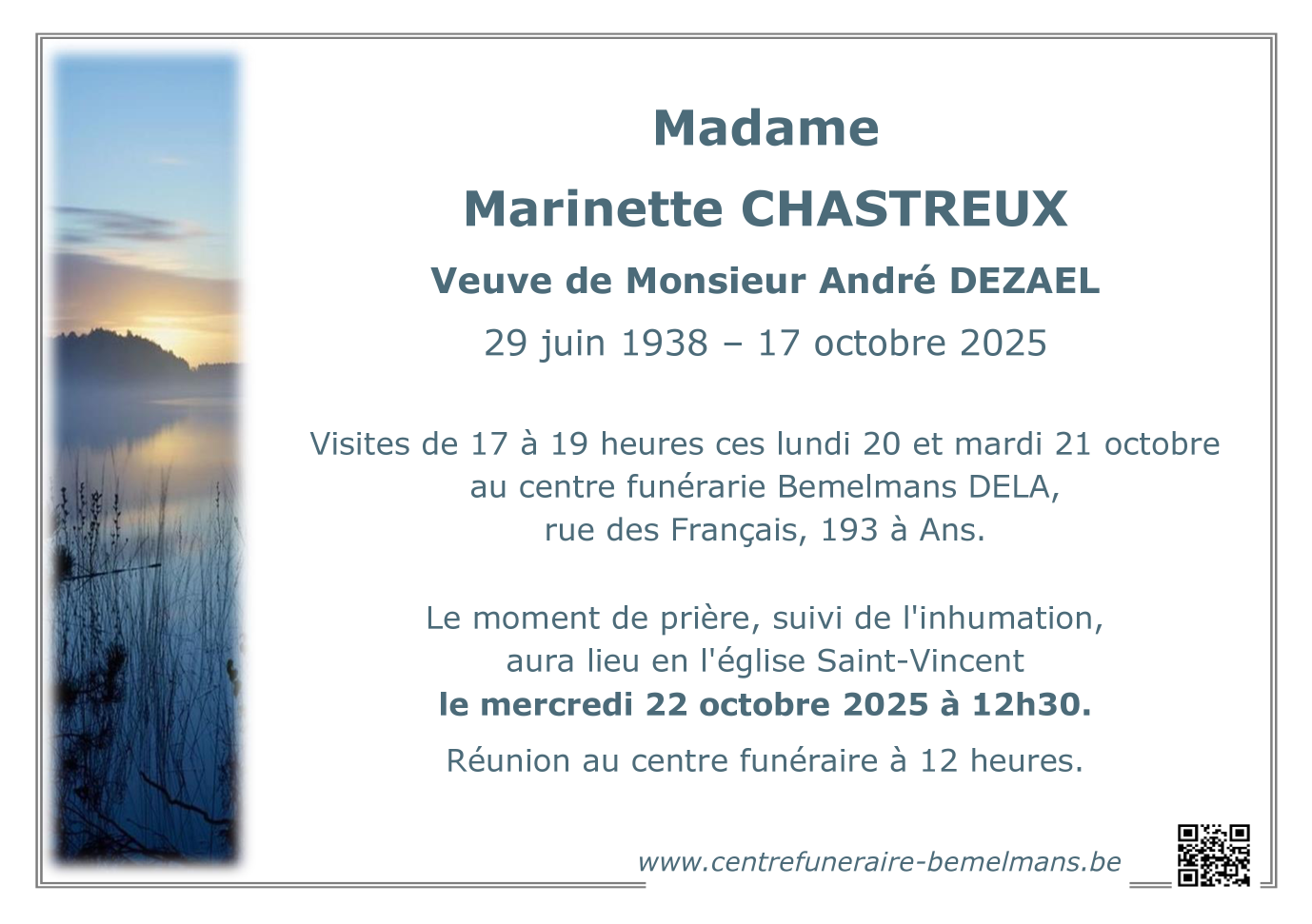 Fallecida en Montegnée (4420, Bélgica) el viernes, 17 de octubre de 2025 a la edad de 87 años