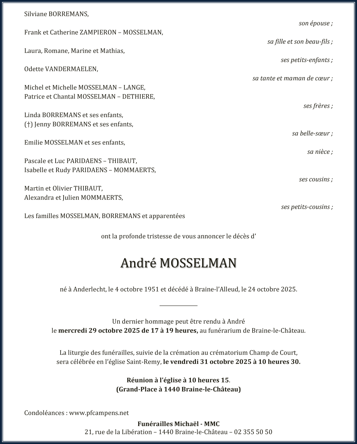 Décédé à Braine-l'Alleud (1420, Belgique) le vendredi 24 octobre 2025 à l'âge de 74 ans
