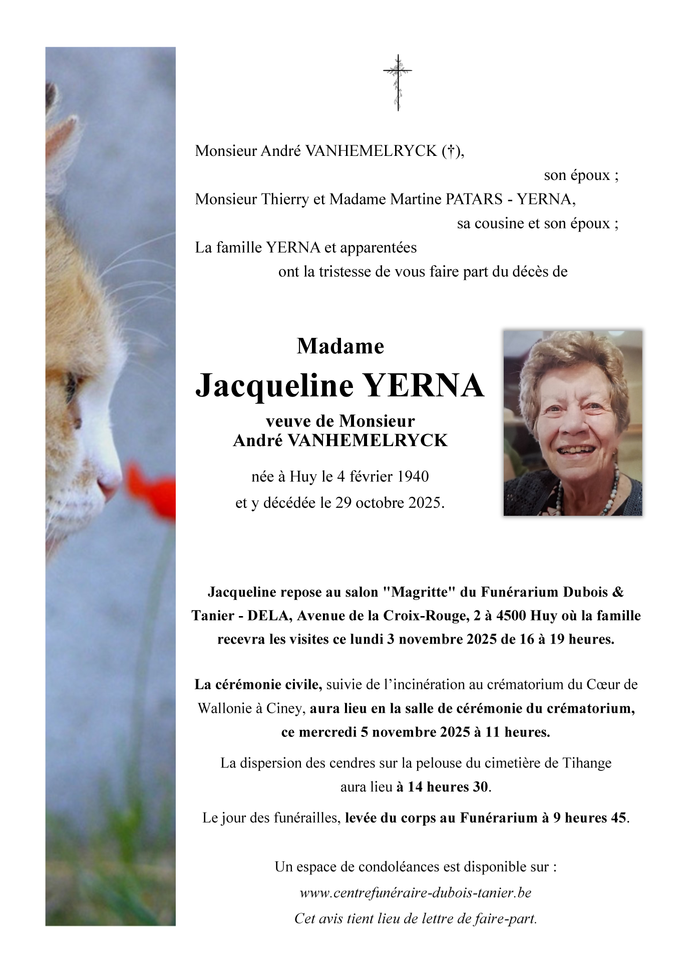 Décédée à Huy (4500, Belgique) le mercredi 29 octobre 2025 à l'âge de 85 ans