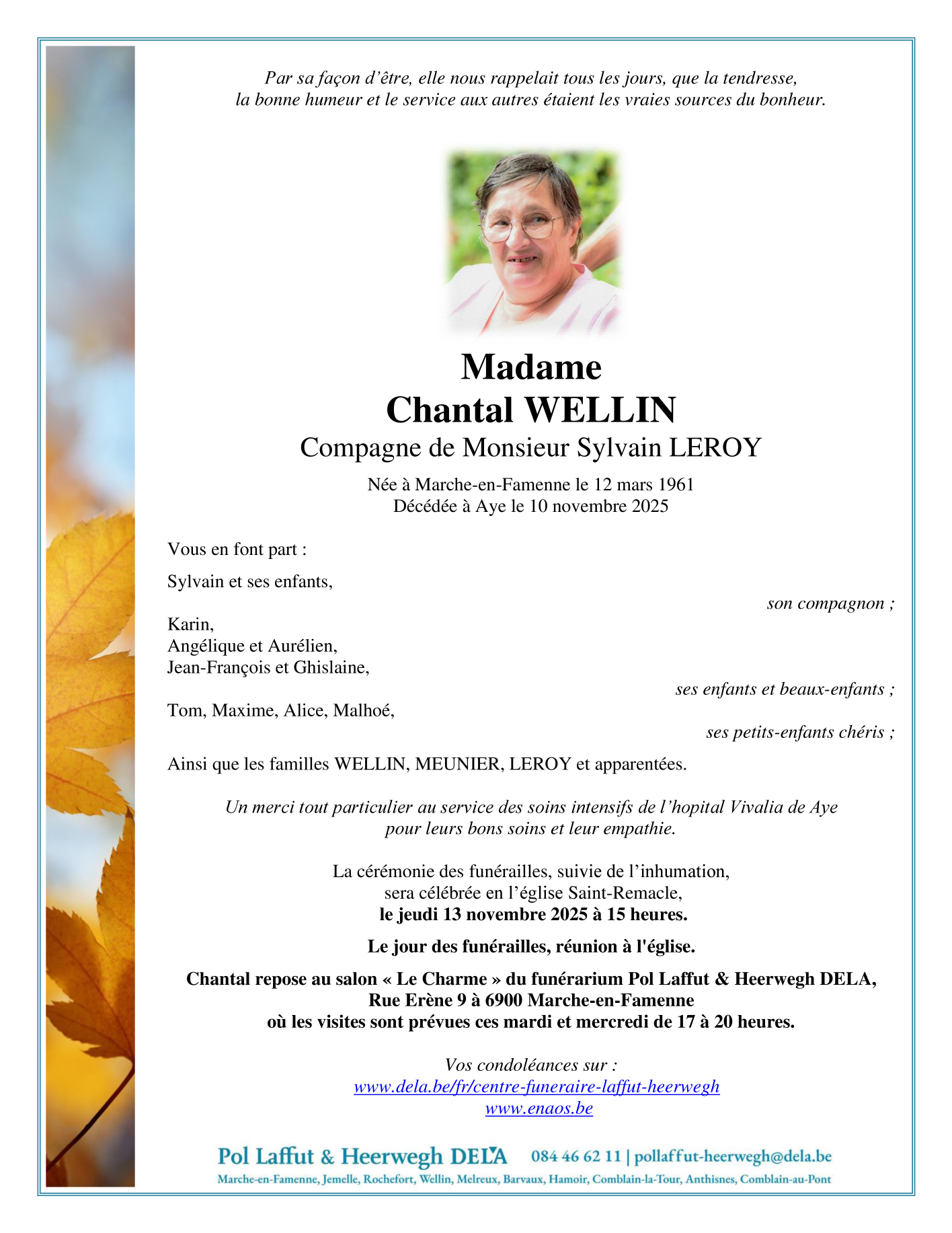 Décédée à Aye (6900, Belgique) le samedi 8 novembre 2025 à l'âge de 64 ans