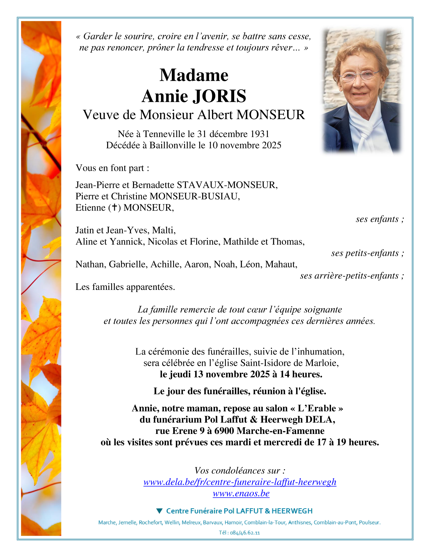 Décédée à Baillonville (5377, Belgique) le lundi 10 novembre 2025 à l'âge de 93 ans
