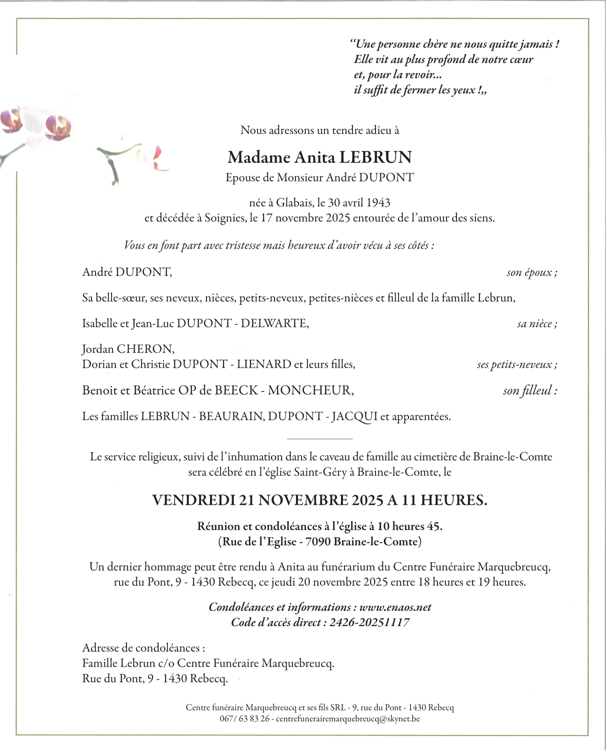Décédée à Soignies (7060, Belgique) le lundi 17 novembre 2025 à l'âge de 82 ans