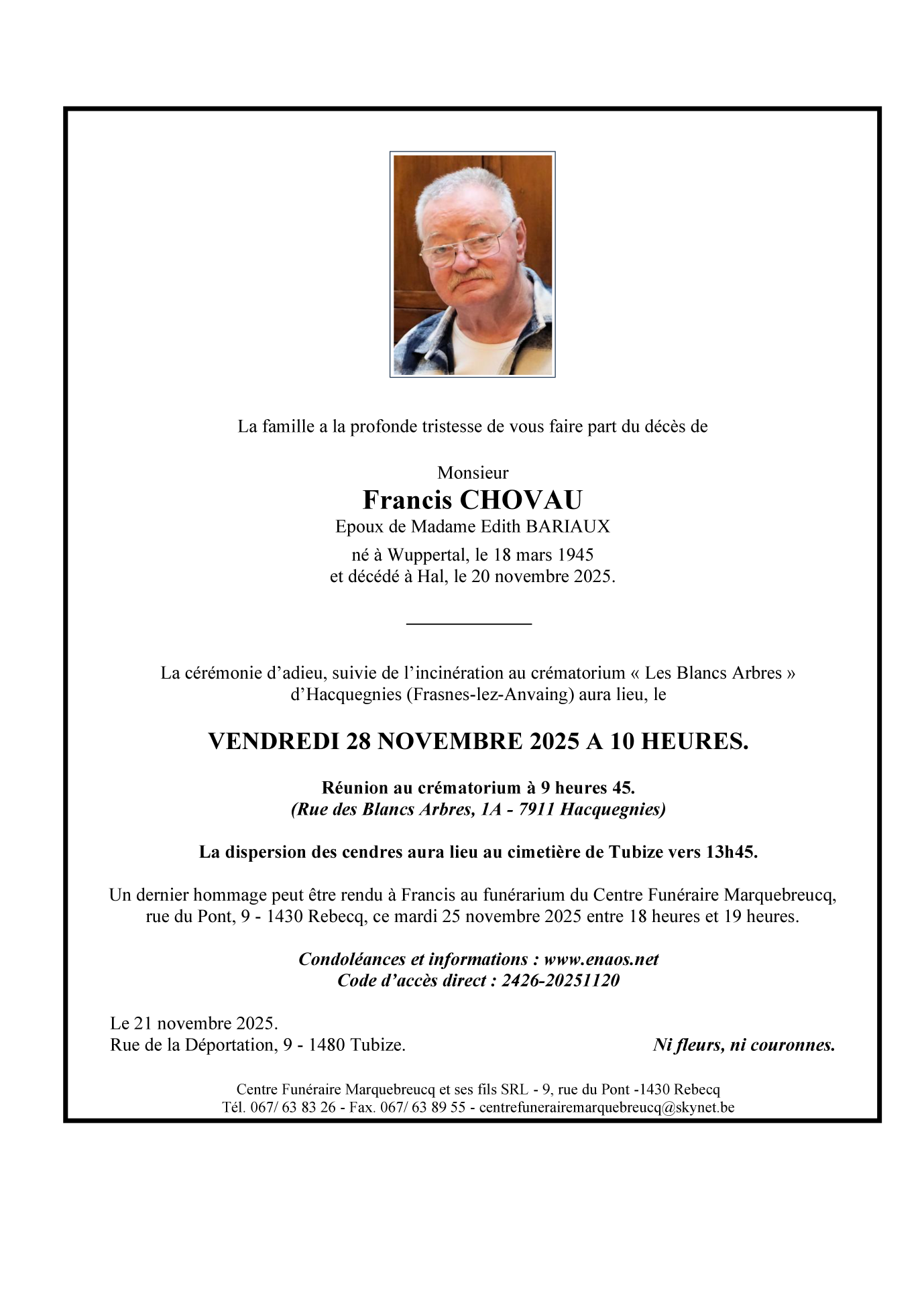 Décédé à Halle (1500, Belgique) le jeudi 20 novembre 2025 à l'âge de 80 ans