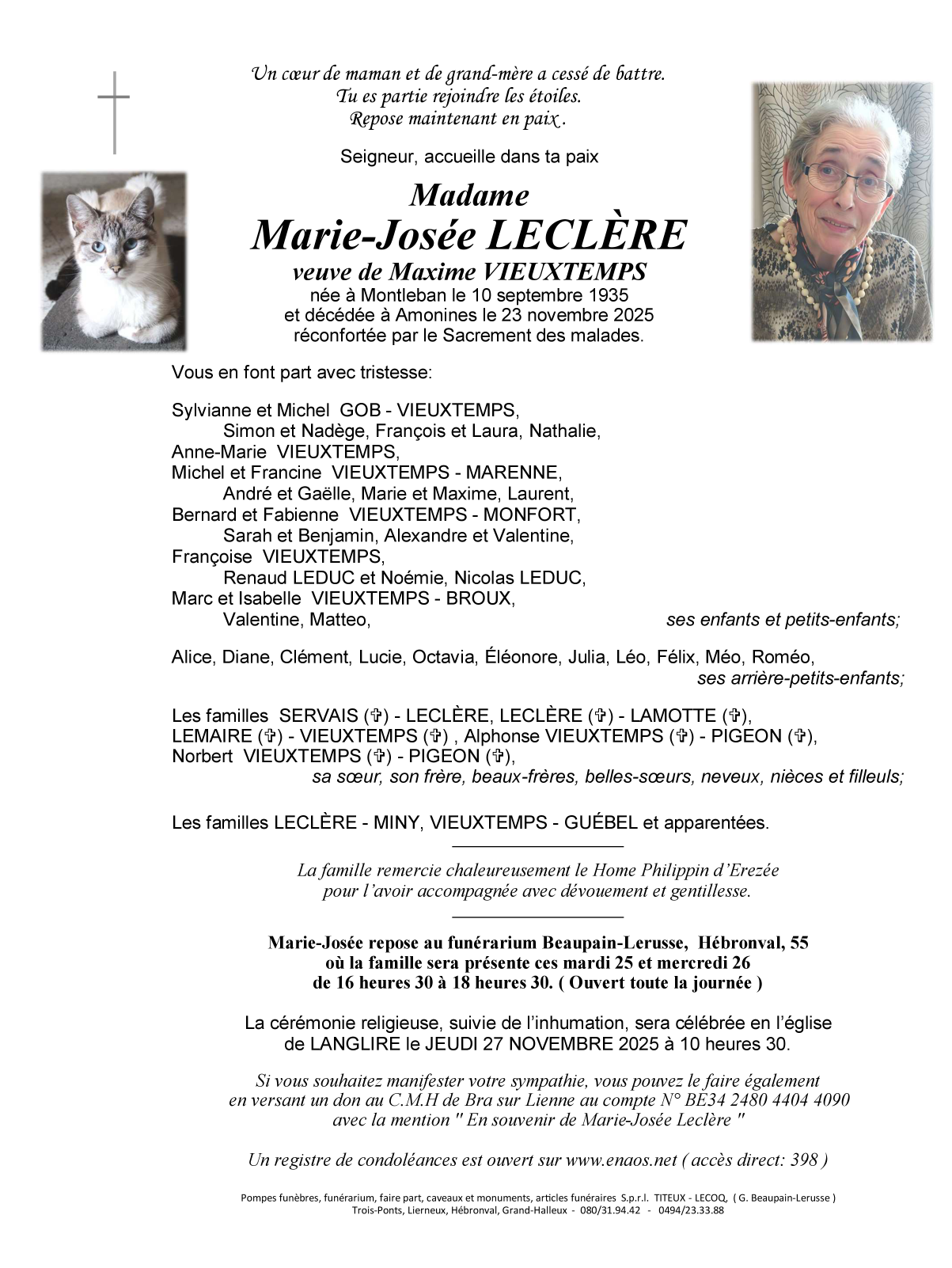 Décédée à Amonines (6997, Belgique) le dimanche 23 novembre 2025 à l'âge de 90 ans