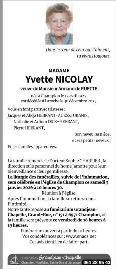 Died in La Roche-en-Ardenne (6980, Belgium) on 30 December 2025 at the age of 98 years