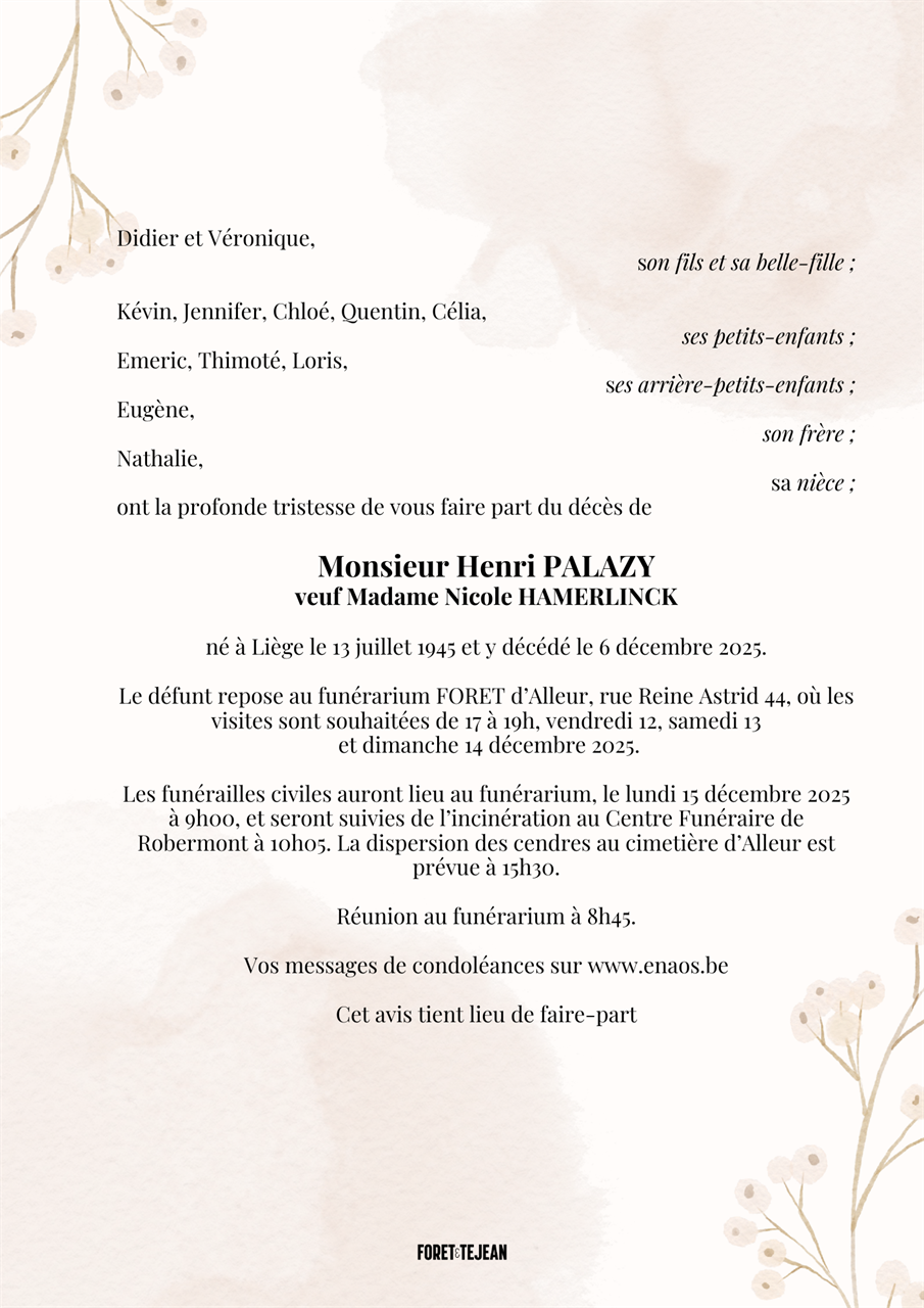 Overleden te Liège (4000, België) op zaterdag 6 december 2025 op 80-jarige leeftijd