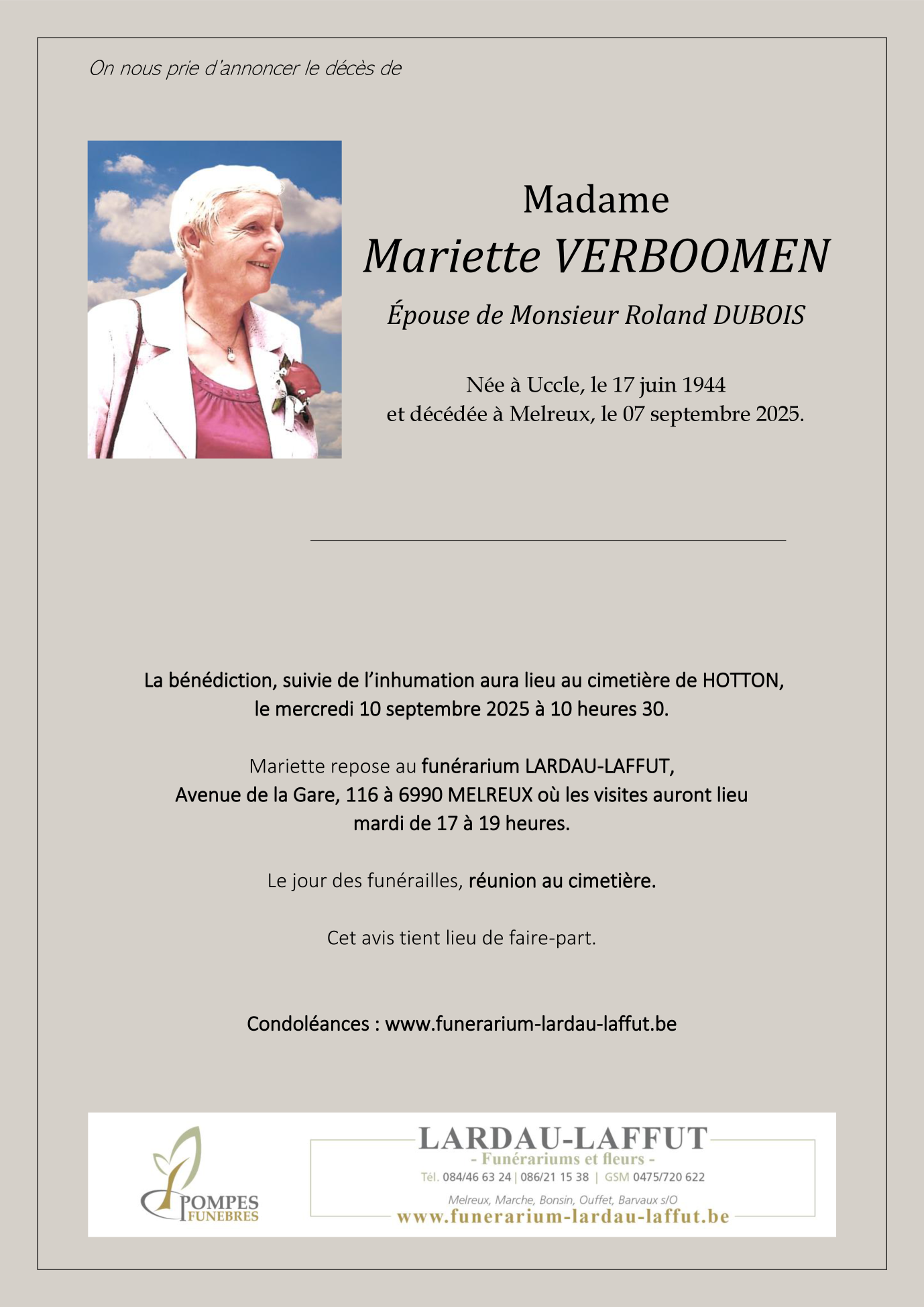 Fallecida en Melreux (6990, Bélgica) el domingo, 7 de septiembre de 2025 a la edad de 81 años